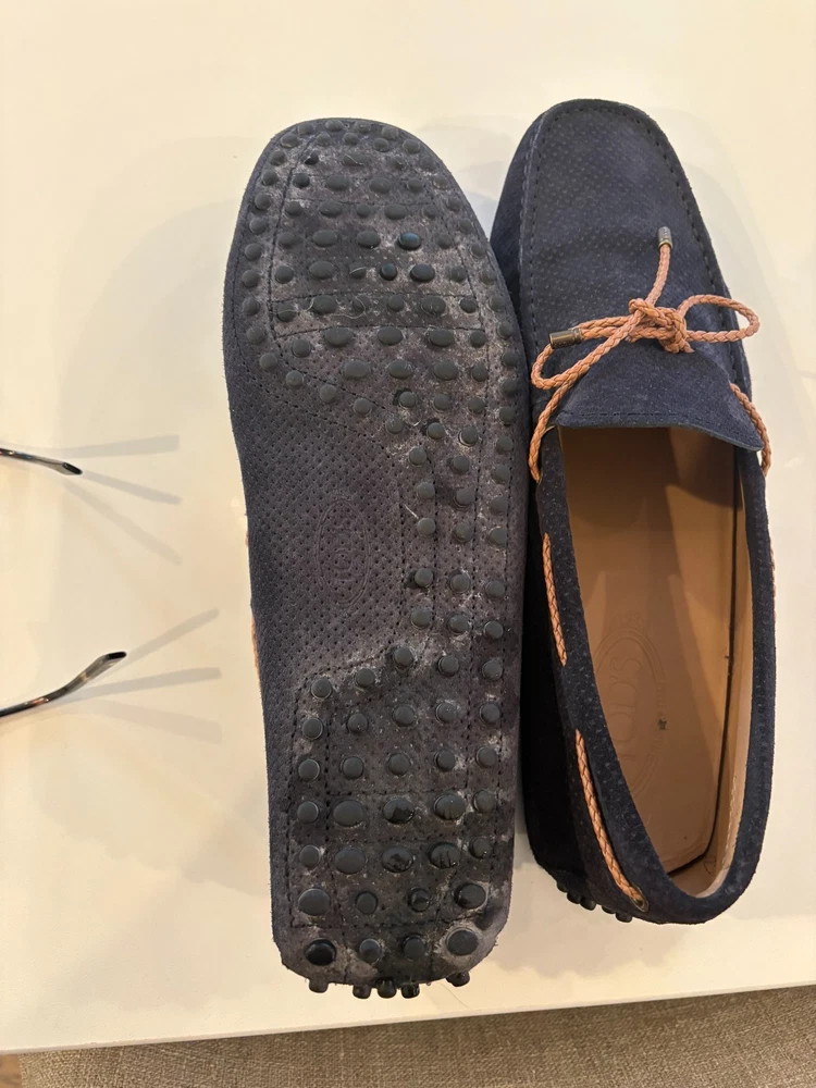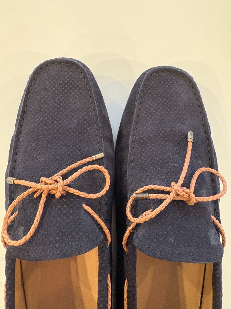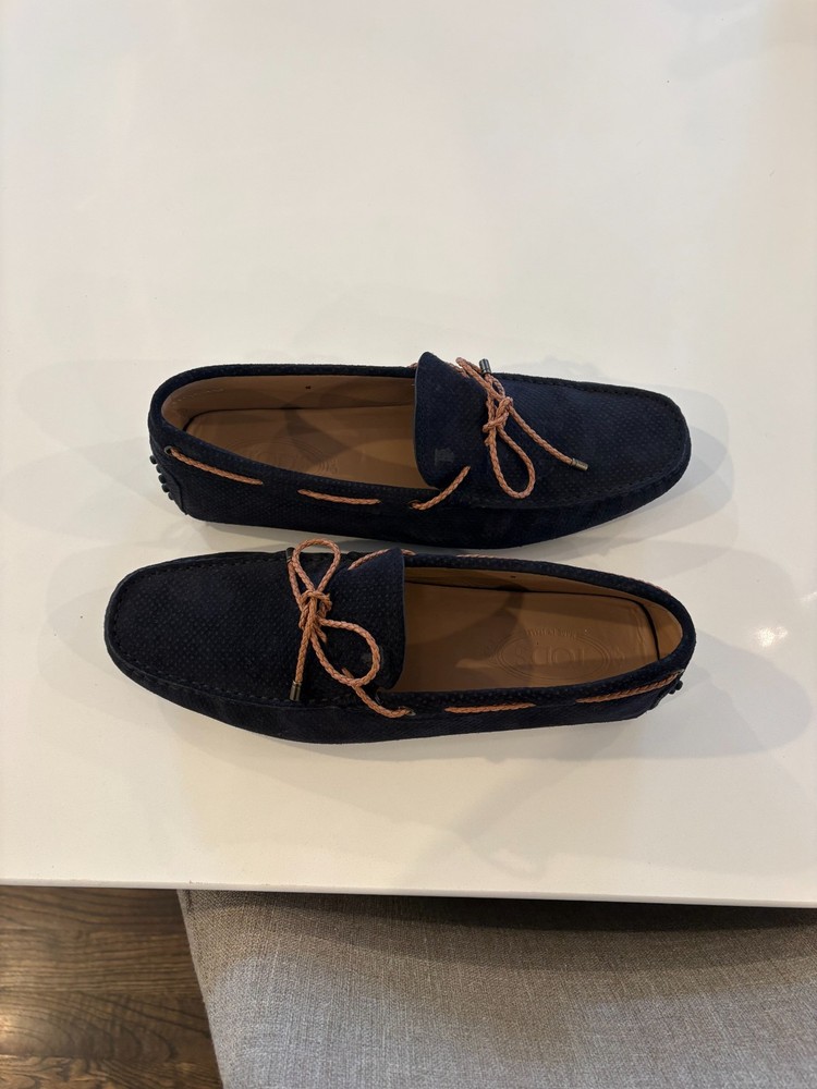 These Tod's loafers are a stylish choice for men in size 9 who prefer a casual slip-on style. The blue suede material and leather lining add a touch of luxury to the comfortable flat design. With a round toe shape and leather insole, these loafers are perfect for casual occasions during the warmer seasons. The Tod's brand ensures quality and craftsmanship, making these loafers a great addition to any man's shoe collection.