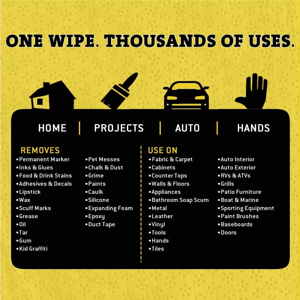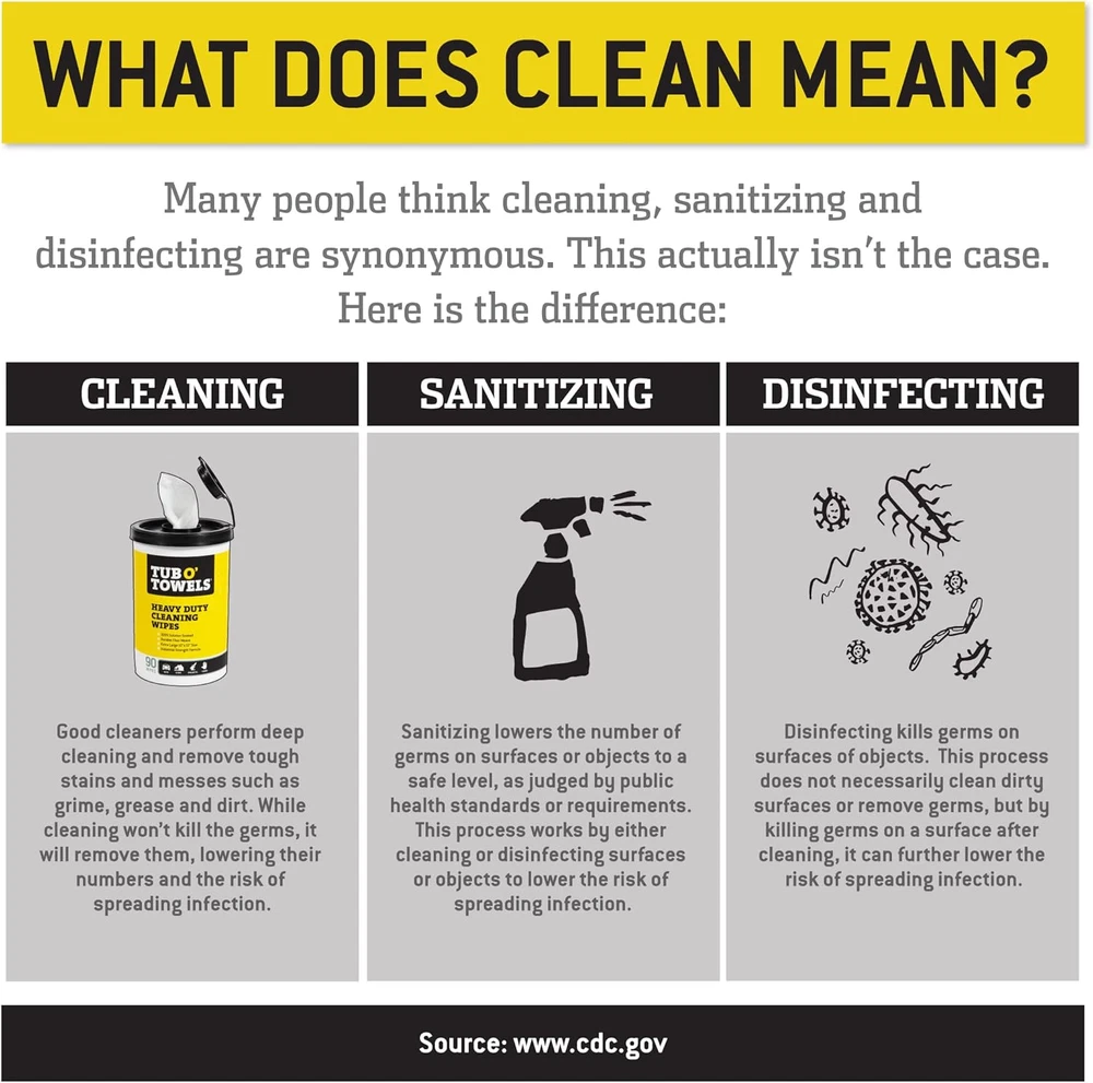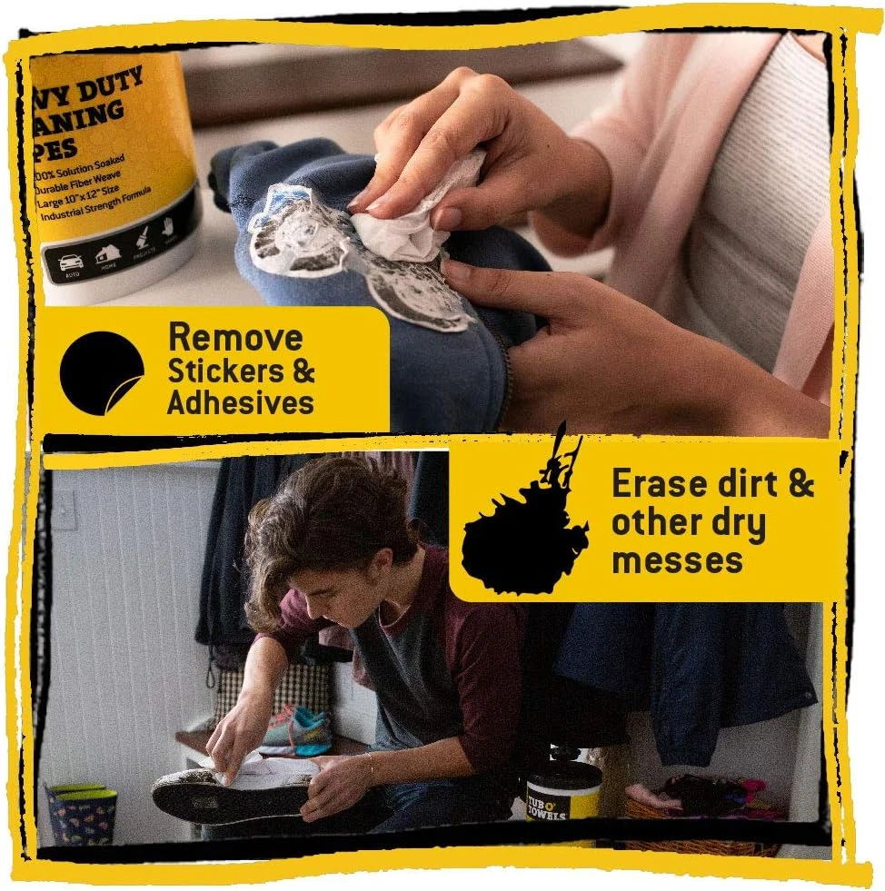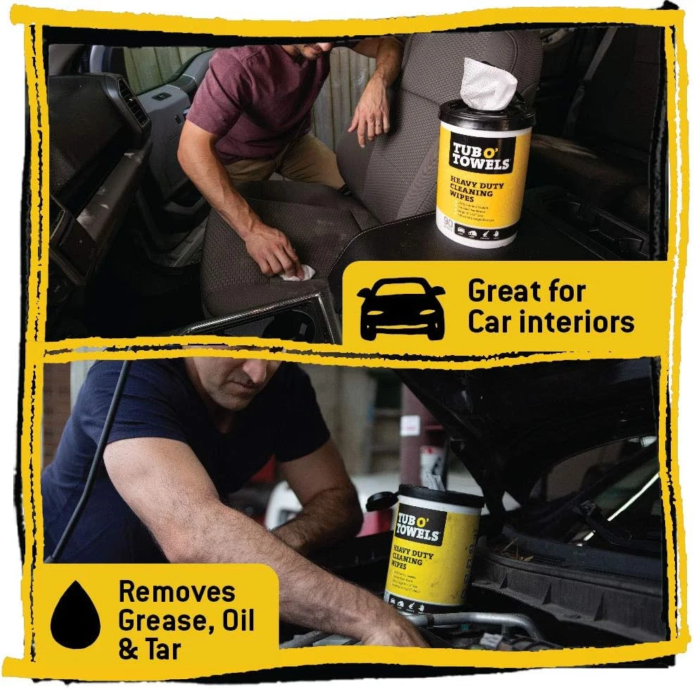10" x 12" heavy duty wet cleaning wipes. The strongest and largest wet paper towel cleaning wipe. No water required Removes heavy stains others won't including: grease, tar, ink, paint, permanent marker, wax, scuffs, lip stick, nail polish, food and drinks, pet stains and more These moist towels are gentle on hands and skin. Wipes contain aloe, Vitamin E and lanolin to protect your hands and leave them clean and soft. Our heavy duty cleaning wipes do not contain disinfecting or antibacterial properties Tub O' Towels can be used as automotive and car cleaning wipes, for the office, boating, and RV's, and around the home Use these tough cleaning wipes on Fabric and Carpet, Leather, Vinyl, Metal, Counter Tops, Walls, For Cleaning Appliances, Tile, Cabinets, Toilets, Tubs and more TUB O TOWELS 90 COUNT HEAVY DUTY CLEANING WIPES