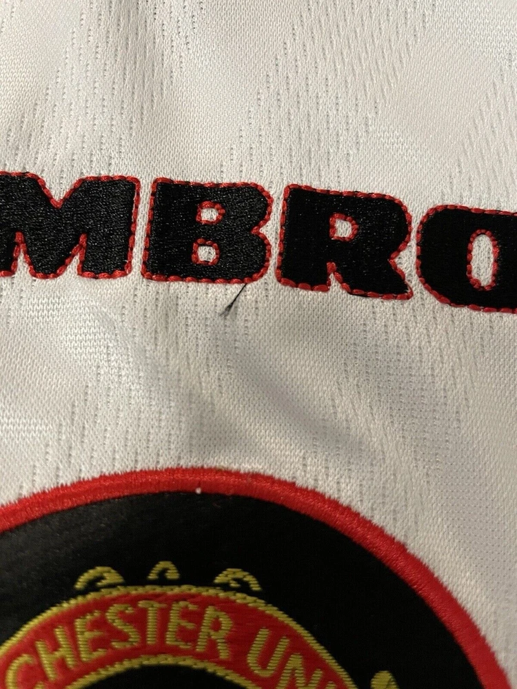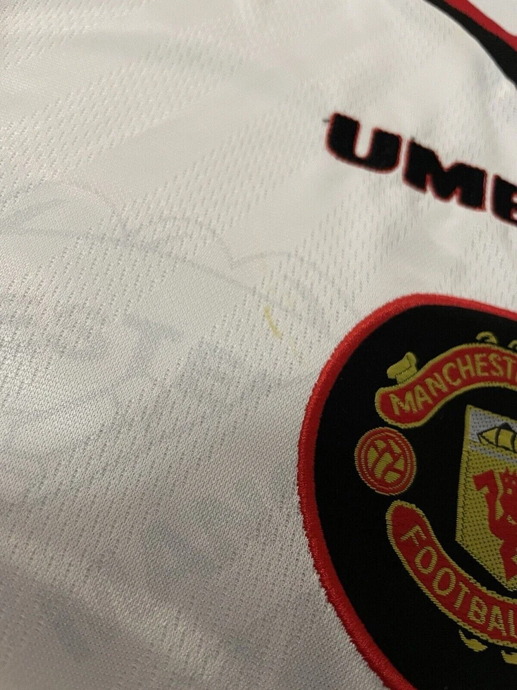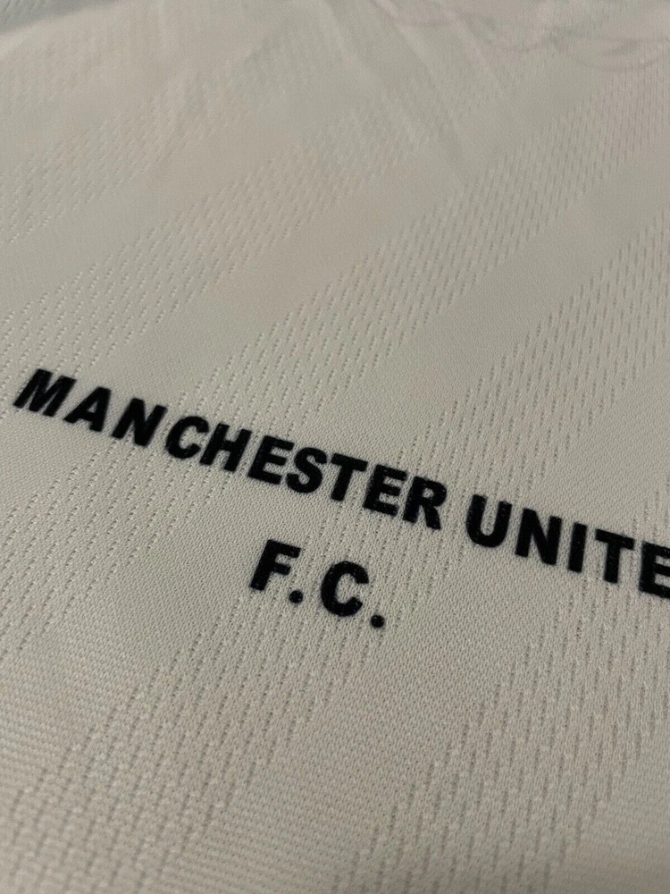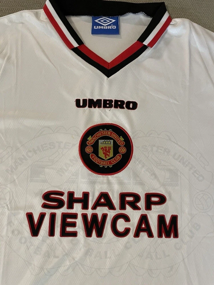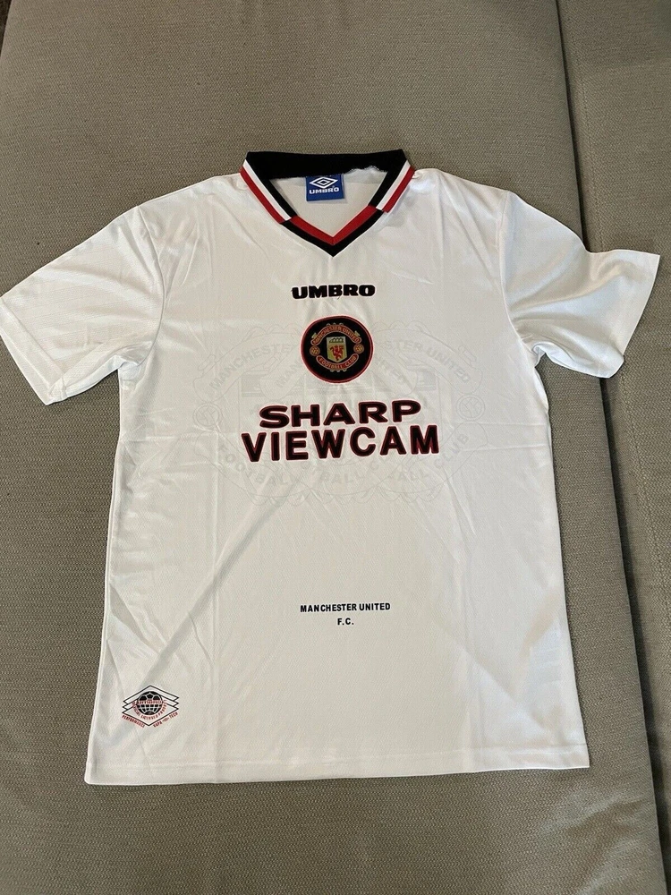 Show your support for Manchester United with this Umbro retro-style away jersey from the 96/97 season. Made for men, this jersey features the iconic white color and the team's emblem on the chest. The size is a comfortable L, which fits most fans comfortably. Perfect for soccer enthusiasts and Manchester United supporters, this jersey is a must-have for any collection. Wear it proudly to the next game or display it in your fan cave. LIKE NEW - LIKE NEVER WORN UNIQUE L somehwhat slim fit, Please keep in mind Soccer Jerseys tend to be delicate, hand washed and not strong chemicals in extremely recommended, and DO NOT dry on dryer. Air dry only. Returns for damage caused by costumer wont be accepted. If interested in measurements, do not hesitate to ask for them, that way you avoid returning the item.
