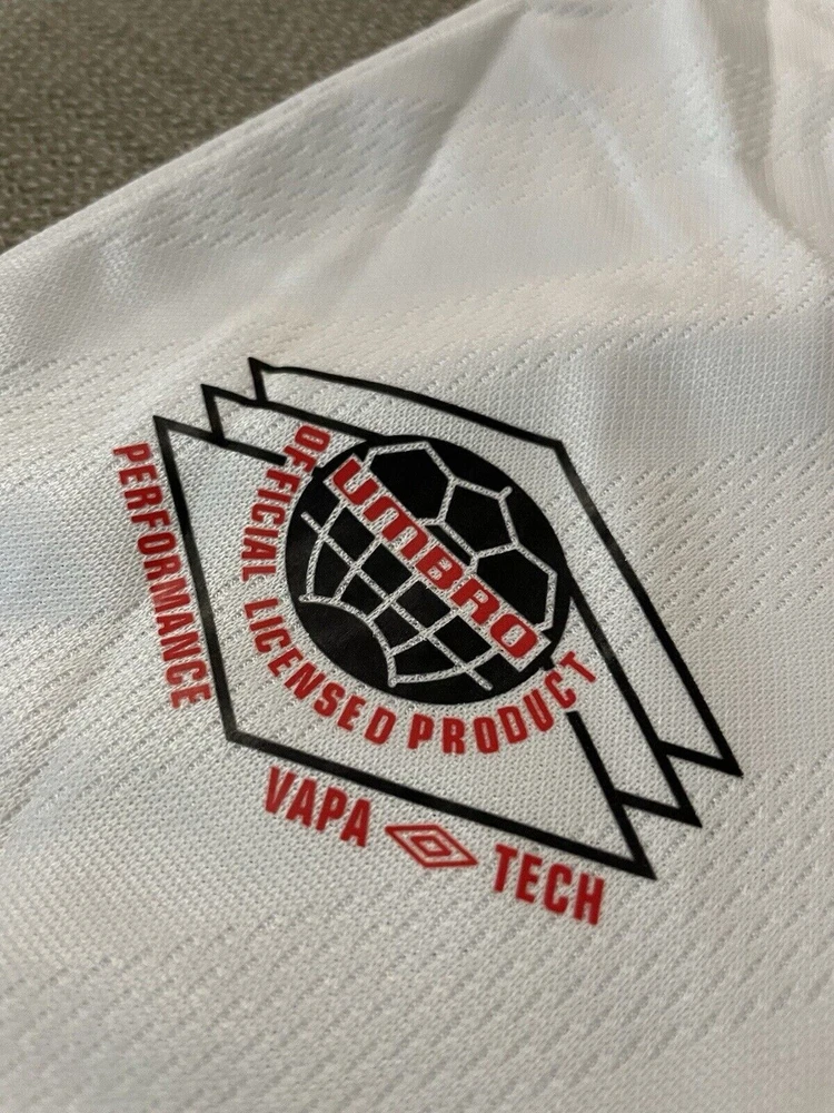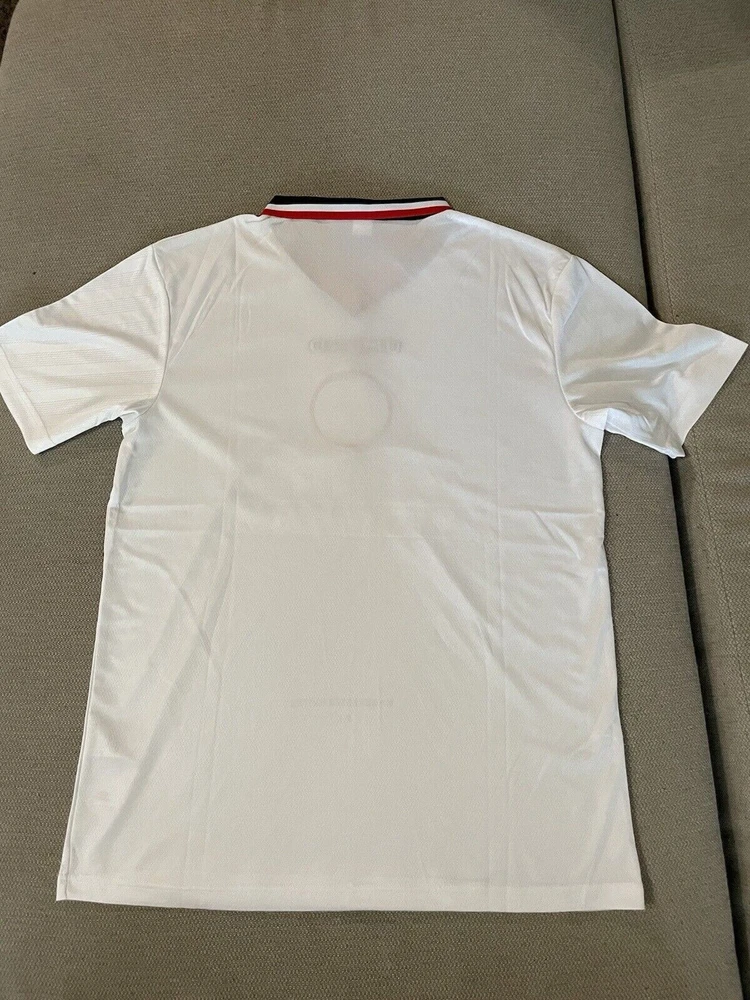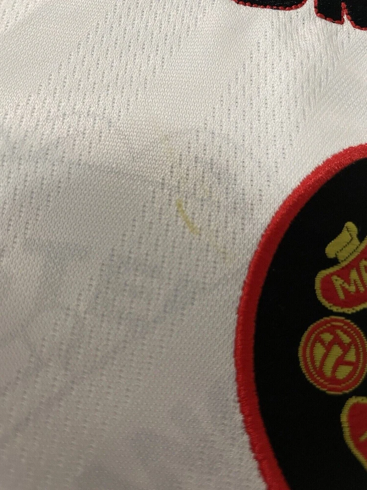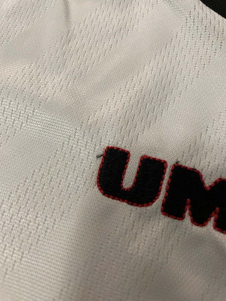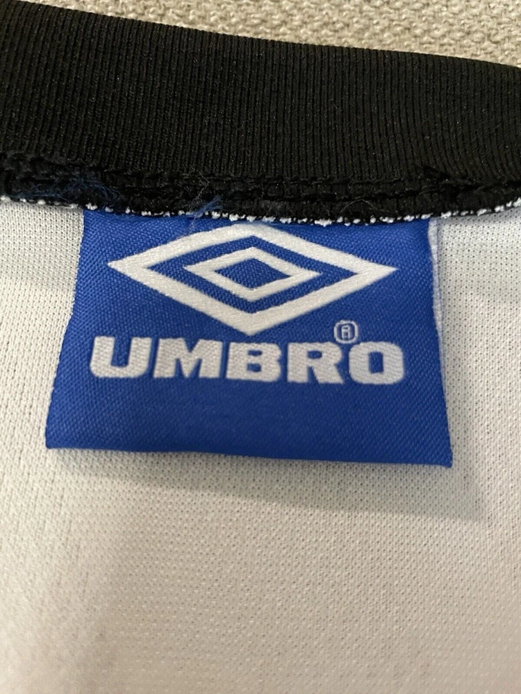Show your support for Manchester United with this Umbro retro-style away jersey from the 96/97 season. Made for men, this jersey features the iconic white color and the team's emblem on the chest. The size is a comfortable L, which fits most fans comfortably. Perfect for soccer enthusiasts and Manchester United supporters, this jersey is a must-have for any collection. Wear it proudly to the next game or display it in your fan cave. LIKE NEW - LIKE NEVER WORN UNIQUE L somehwhat slim fit, Please keep in mind Soccer Jerseys tend to be delicate, hand washed and not strong chemicals in extremely recommended, and DO NOT dry on dryer. Air dry only. Returns for damage caused by costumer wont be accepted. If interested in measurements, do not hesitate to ask for them, that way you avoid returning the item.
