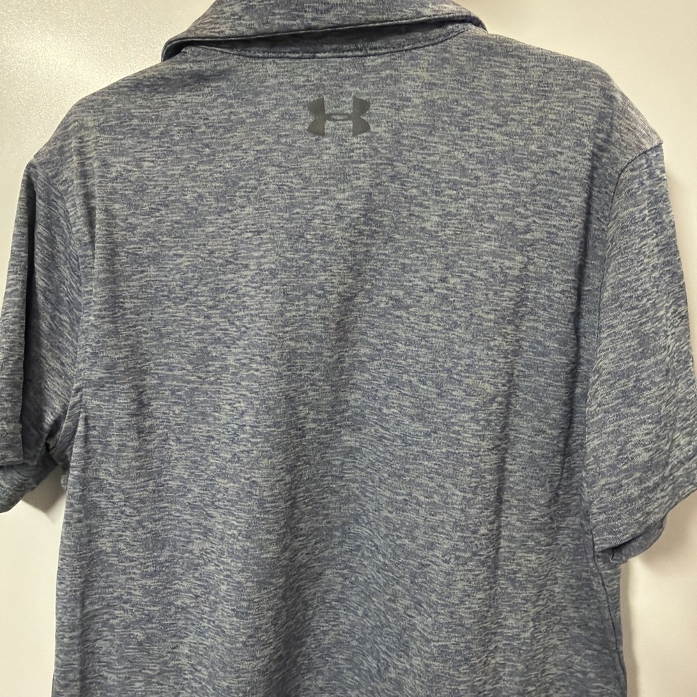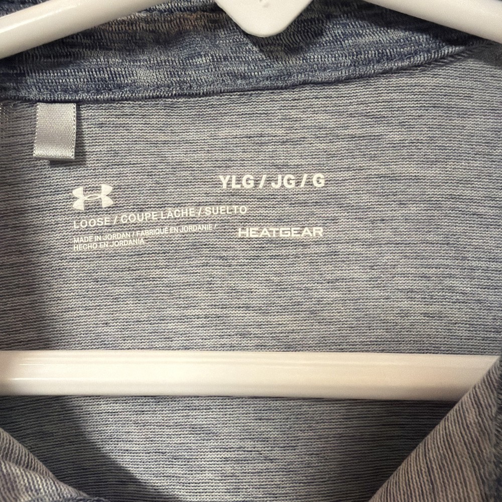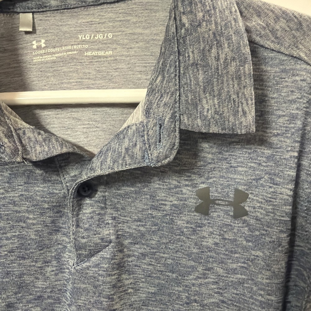 The product is an Under Armour boys' polo shirt in size youth large, designed specifically for golfing activities. The shirt is solid blue in color with short sleeves, making it both stylish and comfortable for young golf enthusiasts. With the Under Armour brand known for quality athletic apparel, this polo is sure to provide the performance and durability needed for a young golfer on the course.