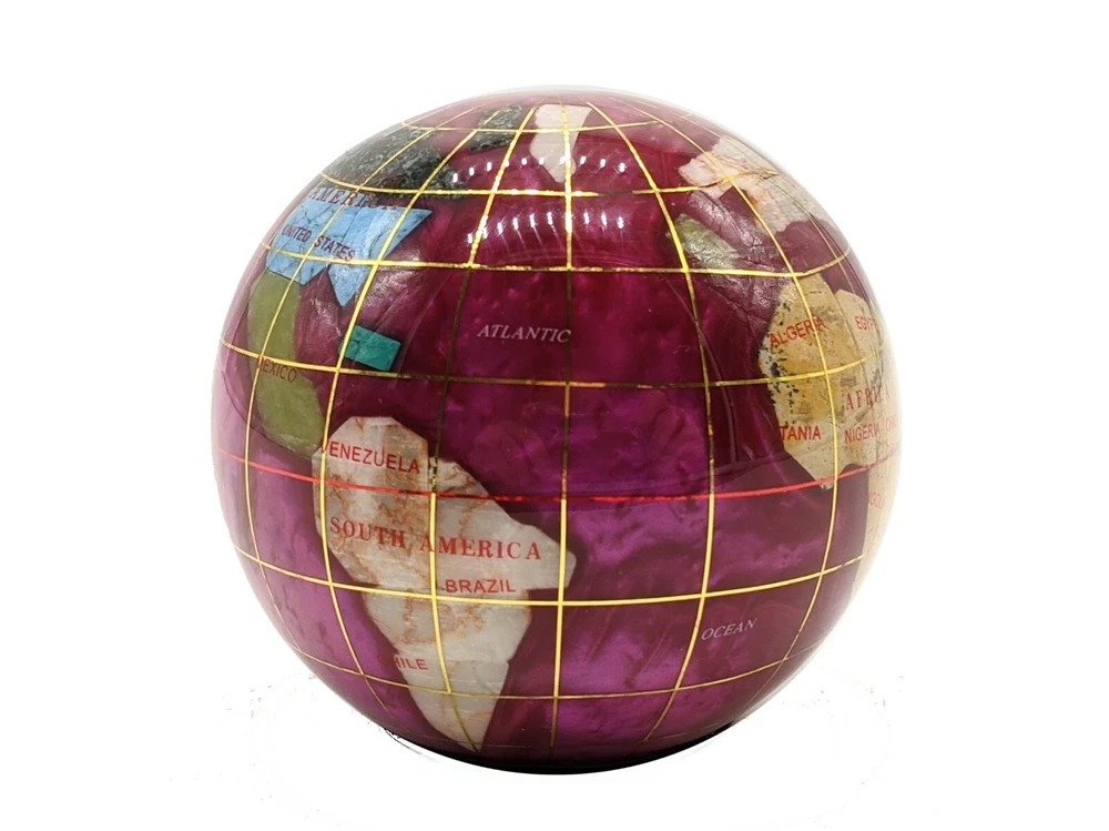 This unique Pink gemstone globe paper weight is brand new, It is painstakingly put together all by hand, using a variety of semi-precious gemstones from all over the world! The Oceans are made of pearl swirls (it was very complicated and expensive procedure, precise control of temperature is the most essential factor in the processing cycle). This is a huge amount of striking and dramatic hand-crafted stone work. 3" Diameter Gemstone Globe Paperweight Highest quality Gemstones are used Ocean Part made of Pearl powders