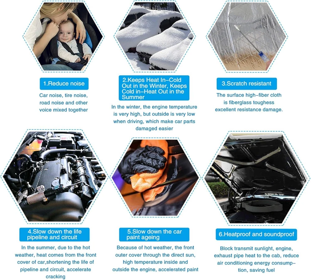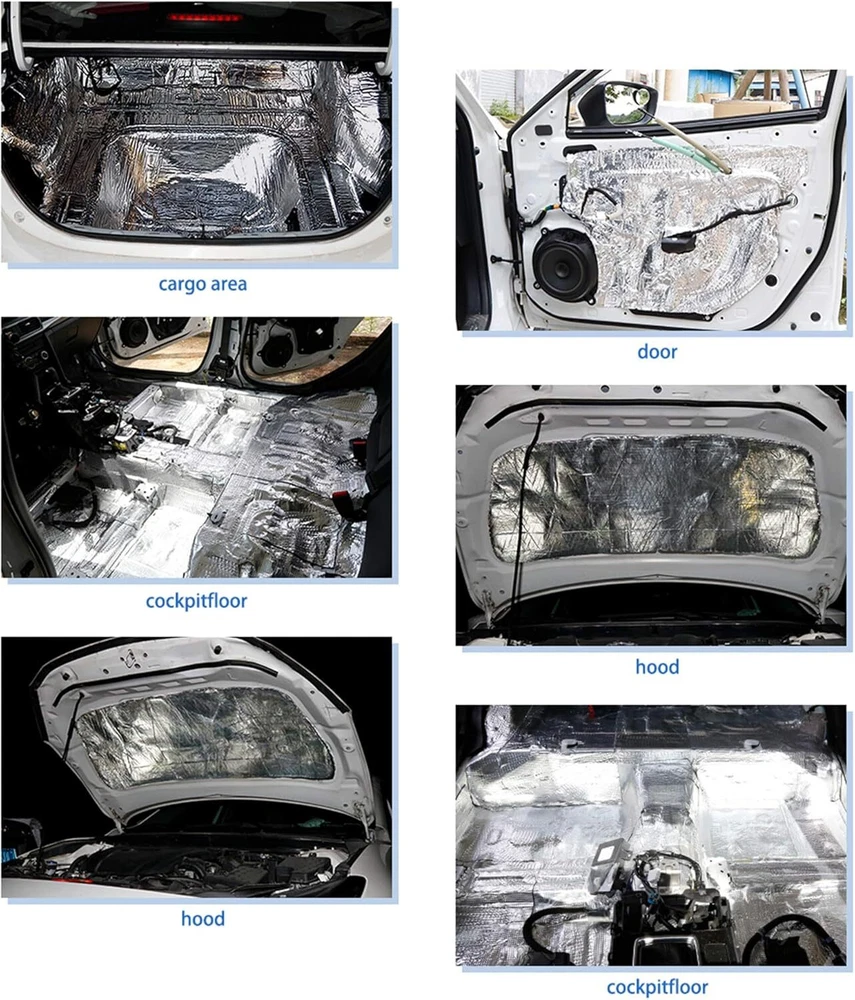 Strong sound insulation and absorption performance,heat insulation mat The surface high-fiber cloth is fiberglass. Heatproof.Block transmit sunlight, engine, exhaust pipe heat to the cab, reduce air conditioning energy consumption, saving fuel Slow down the life pipeline and circuit.In the summer, due to the hot weather, heat comes from the front cover of car,shortening the life of pipeline and circuit, accelerate cracking Slow down the car paint ageing.Because of hot weather, the front outer cover through the direct sun, high temperature inside and outside the engine, accelerated paint aging Keeps Heat In-Cold Out in the Winter, Keeps Cold in-Heat Out in the Summer.In the winter, the engine temperature is very high, but outside is very low when driving, which make car parts damaged easier Product Description Description: Strong sound insulation and absorption performance,heat insulation, Reducing energy consumption with strong performance of heat insution Strong self-viscous performance Installation: 1, Remove the door panels 2, Install the screws back in original place, it will easy be found when you mount, avoiding holes be covered 3, With roller tools will make insulation materials and sheet metal firm fit, and play best adhesive, damping performance 4, According to the effect you want choose construction program, only single Soundproof Plate or single Heat Noise Insulation Cotton or Both them. 5, You can also use on car roof floors, hood , firewall, chassis, trunk room, trunk lid and so on.. Do not cover the chassis wiring or air holes.