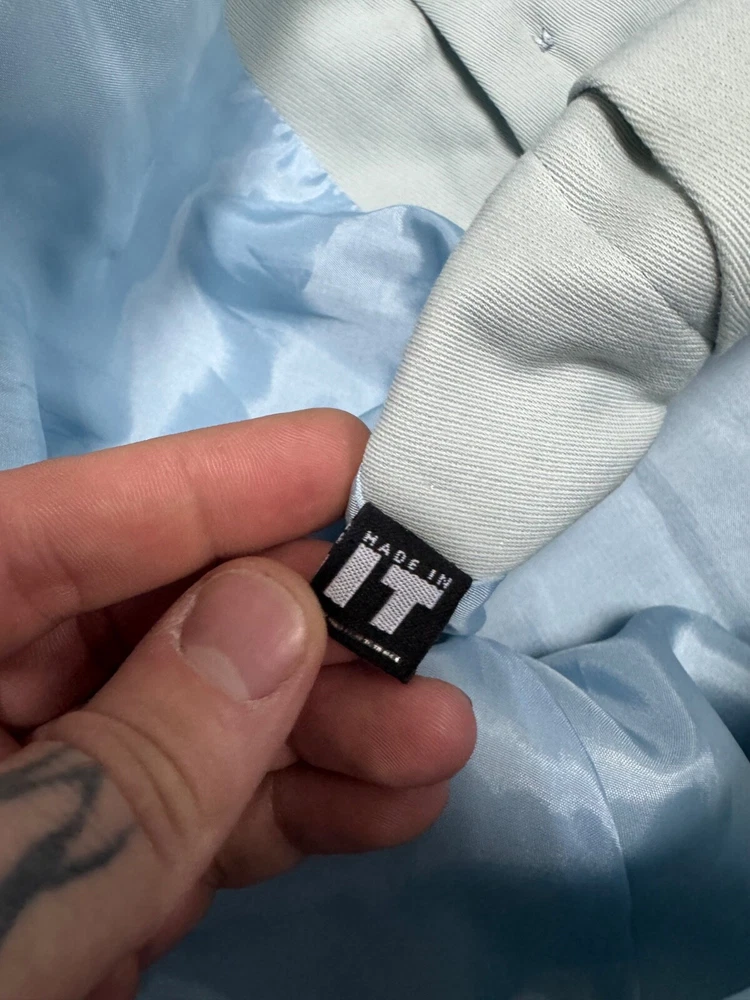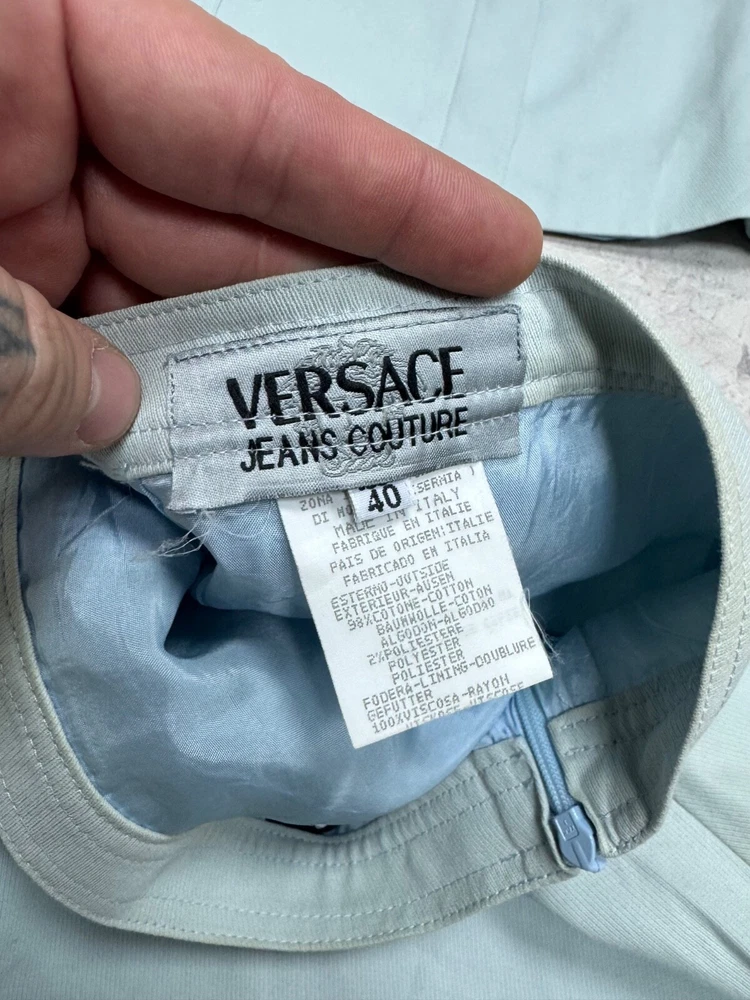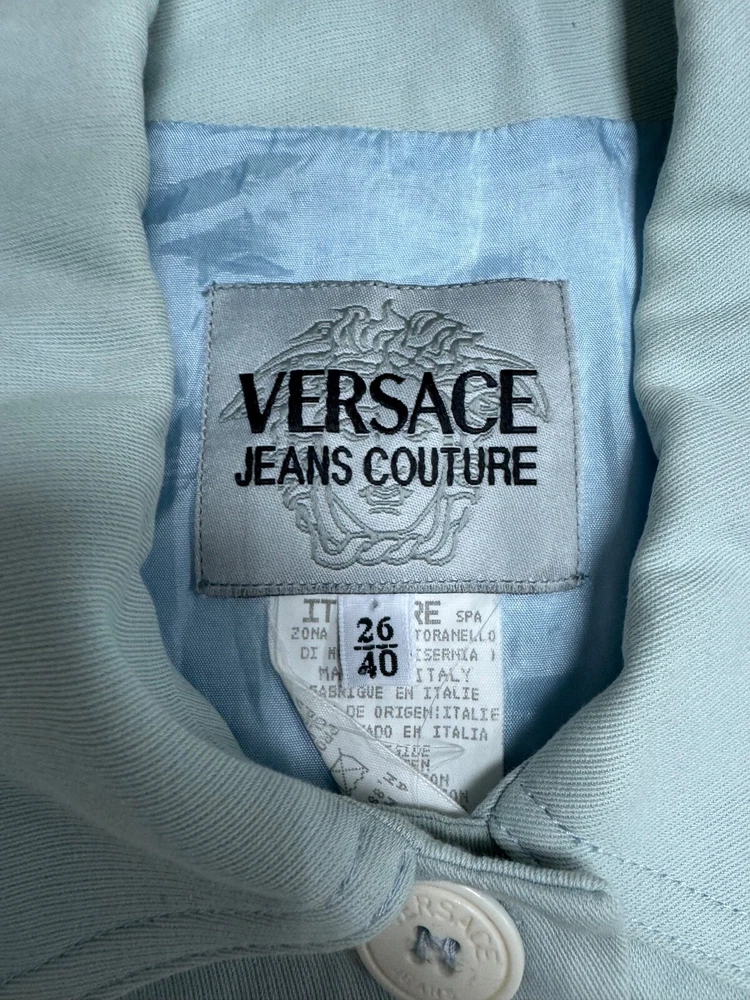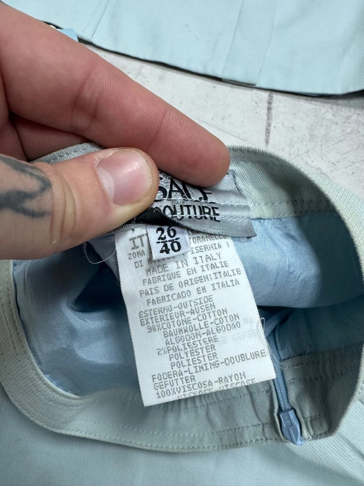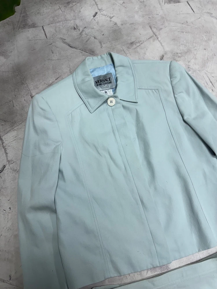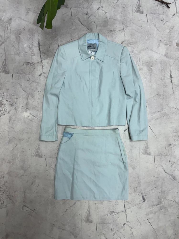 This is a Versace Jeans Couture skirt suit for women in size 40. The suit is in a pale blue color and features a regular size type. It falls under the category of Suits & Suit Separates and Women's Clothing.