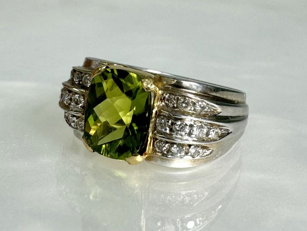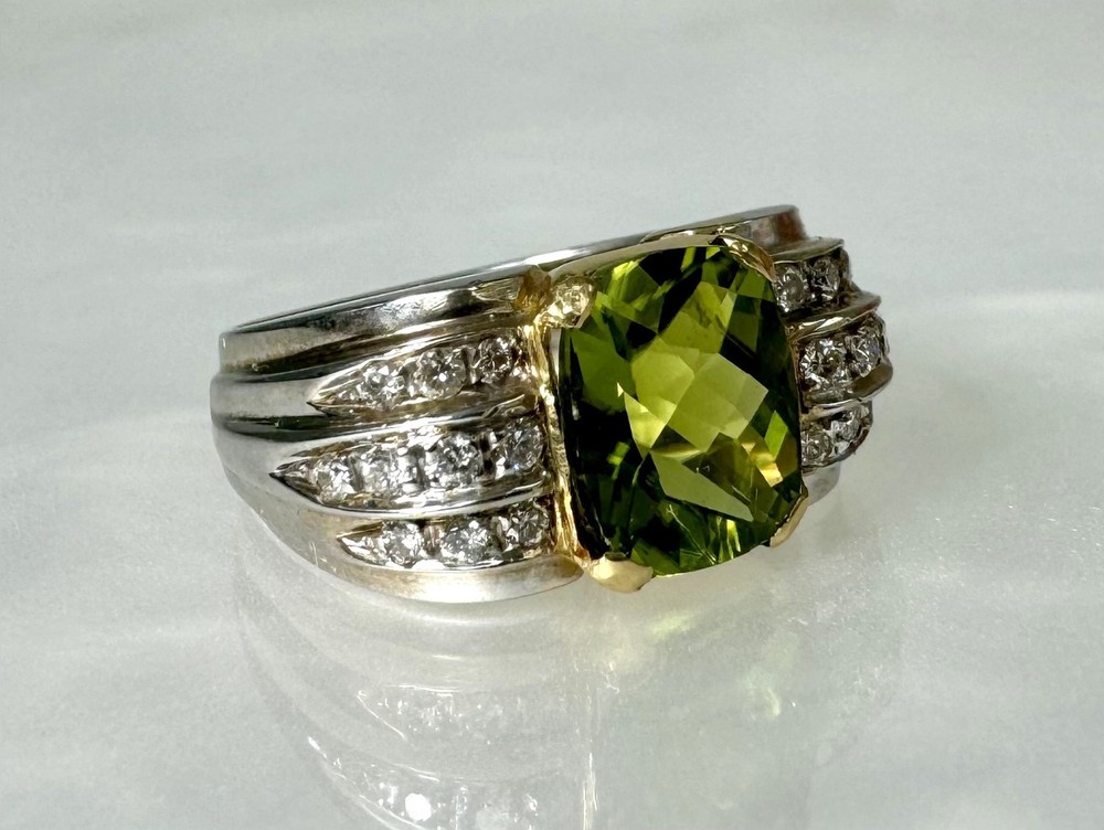 This vintage 18k yellow gold peridot ring features a cushion-shaped green peridot as the main stone, accented with a diamond on the secondary stone. The ring is crafted with natural gemstones and has a total carat weight of 2.90, set in a prong setting style. With a ring size of 7.75, it is a beautiful piece of fine jewelry that exudes nature, love, and healing themes, making it a unique and stunning addition to any jewelry collection. *Ring size: 7 3/4 US *Ring weight: 10.49 Grams *Center stone dimensions: 9.7X7.7mm