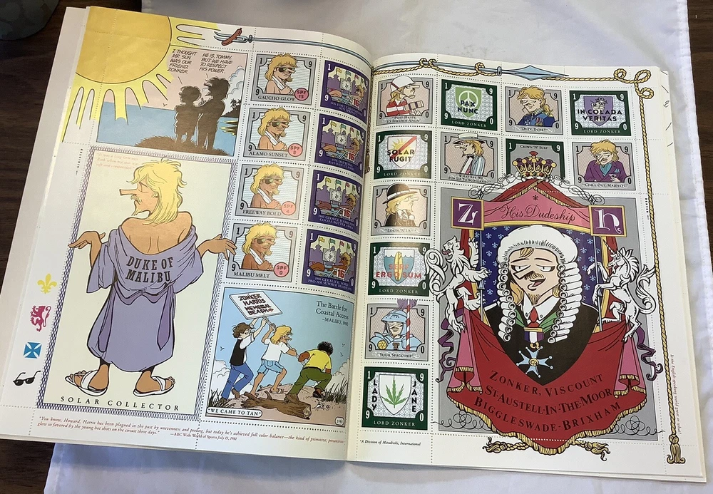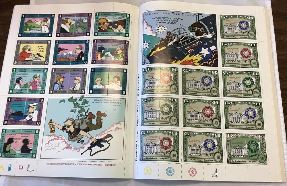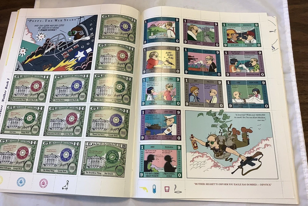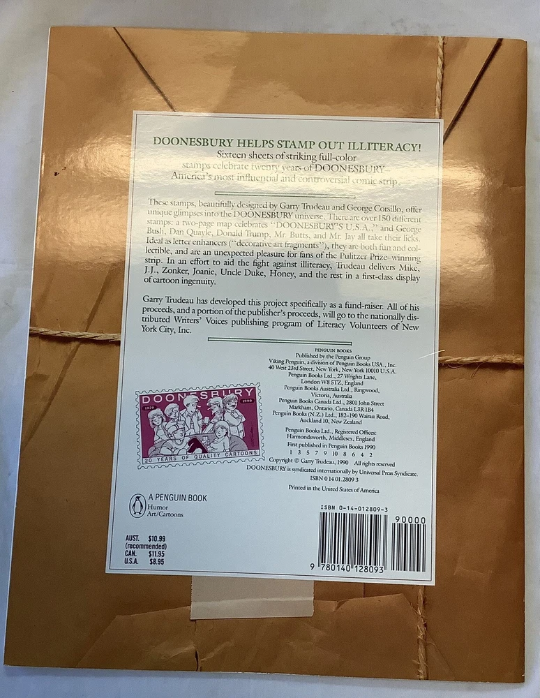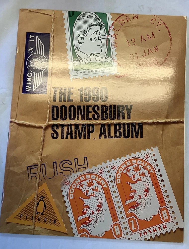 For any fan of The Doonesbury comic strip, this vintage 1990 stamp album is a must-have addition to your collection. Featuring the beloved characters and sharp humor that make Doonesbury a classic, this album is sure to bring hours of laughter and nostalgia. Produced by Penguin Group in the United States, this item is a true gem for any comic book and memorabilia collector. Don't miss out on the chance to own a piece of Doonesbury history! This is in beautiful condition with no damage does not appear to have ever been used I got several of these in a box lot at an estate auction they are all in great condition.