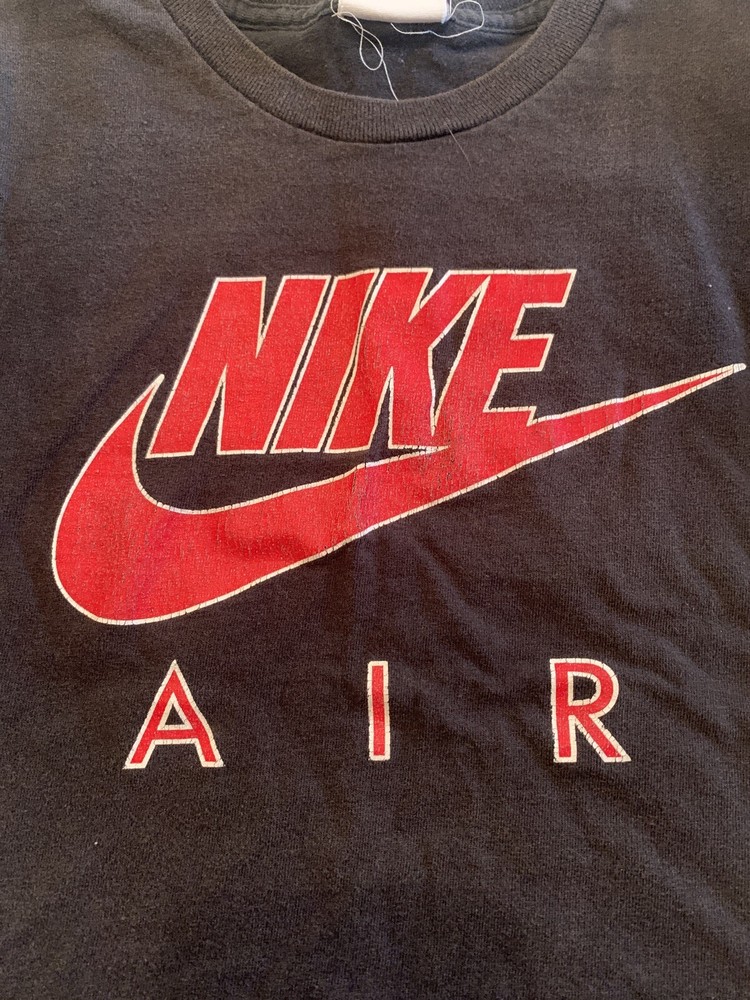This vintage 80s 90s Nike Gray Tag T-Shirt features a spell out Swoosh logo on the front, showcasing the iconic Nike Air theme from the USA. The black cotton t-shirt with a crew neck and short sleeves is perfect for traveling, activewear, and casual occasions. Made in the United States, this regular fit t-shirt in size M is machine washable and embodies the retro style of the 80s and 90s era, making it a unique addition to any boy's wardrobe. Measurements: Pit to Pit: 1 3 Sleeves: — Total Length: 1 7.5