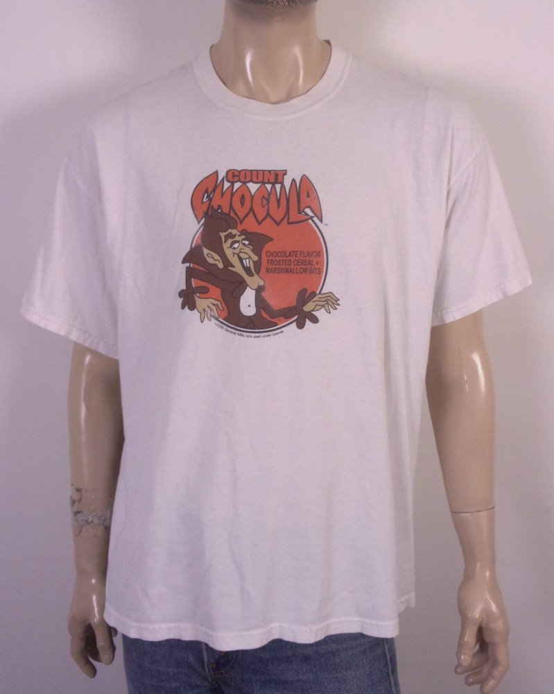 This rare vintage T-shirt from the 90s/00s is a must-have for any Y2K enthusiast! Featuring the iconic Count Chocula cereal character, this shirt is made of 100% cotton and is machine washable for easy care. The solid white color and short sleeves make it a versatile piece that can be worn in any season, whether you're going for a casual look or dressing up for Halloween. The shirt is available in size XL and has a regular fit, with a crew neckline and fabric type of 100% cotton. It's perfect for fans of the classic Count Chocula cartoon and cereal, and is sure to be a standout piece in any vintage clothing collection. Don't miss out on the chance to own this rare and unique T-shirt! Looks awesome! Beautiful true vintage 2006 tee, awesome look and fade to the graphics. Certainly has the look/feel/appearance of a late 90's era tee, falls more into that Y2K era looking type of tee. Has a few very tiny, minor little speck type surface marks, but overall very solid. Measurements: Pit to pit: 23.5 Sleeve length: 8.5 Length: 28.5 Shoulders: 23