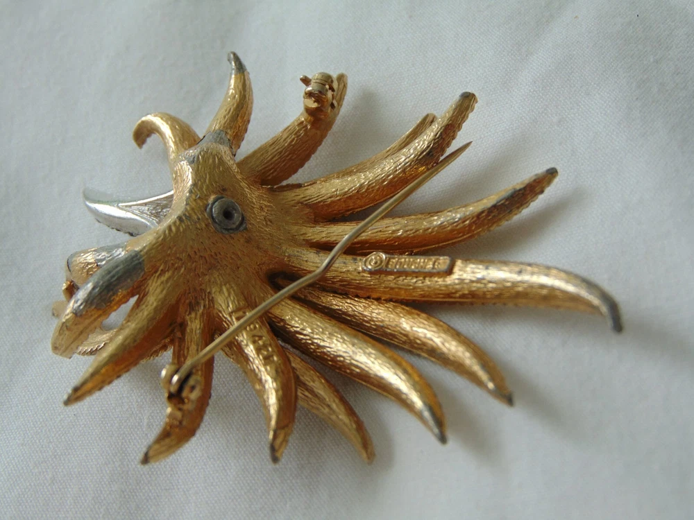 2-3/4 inches long or across, looks like a couple crystals have been replaces. signed Boucher on back of brooch with a number. some wear on plating on back of brooch.