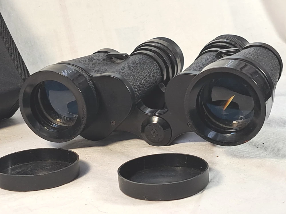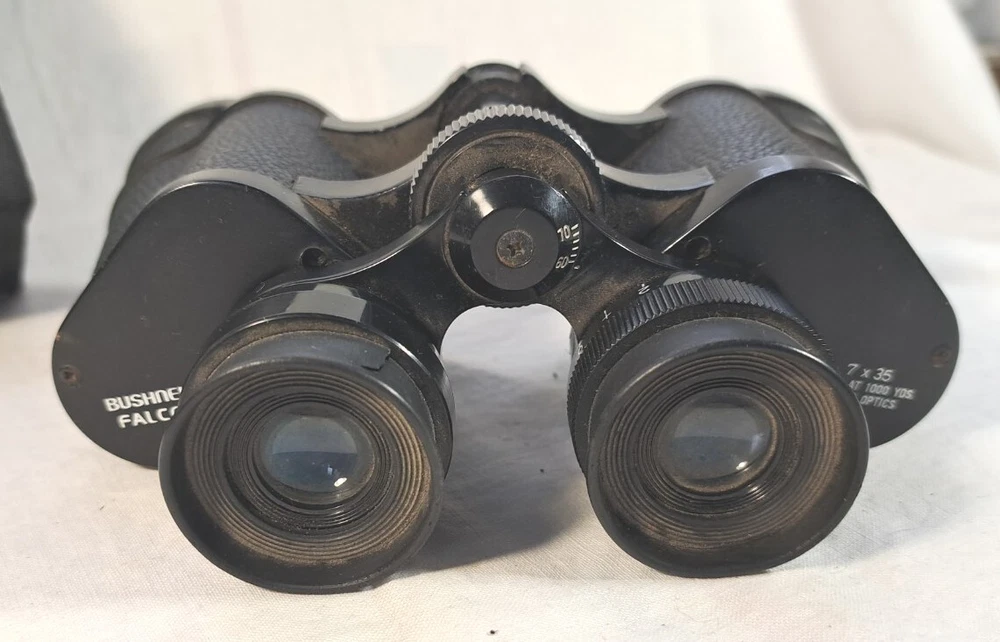 Vintage Bushnell Falcon binoculars measures (opened) almost 7 1/4" wide each lense 2" appear clear and in good condition...with vinyl case