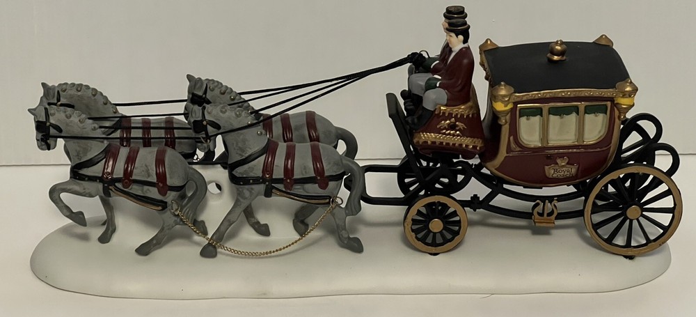 Listing for a 1989 Department 56 Dickens Village figurine ROYAL COACH featuring a Victorian coach with two coachmen and four gray horses pulling the coach. This figurine was retired in 1992. It is in mint condition with original box and packaging material. No chips or discoloration. The outer sleeve to the box has very little storage wear. It is approximately 11 inches wide and 5 inches tall. From my mom's large Dicken's Village collection and she was very particular when putting them away for storage. I will be listing from this collection daily. Thank you for checking it out. Shipped USPS Ground Advantage and shipping will automatically be combined with other items when placed in your cart