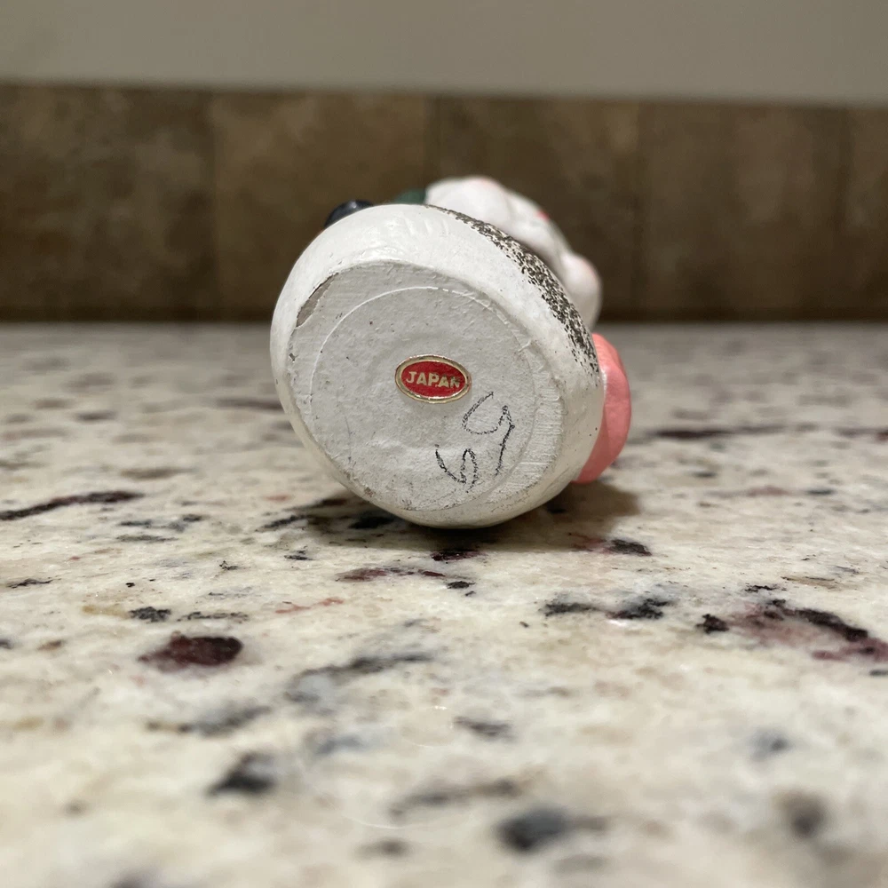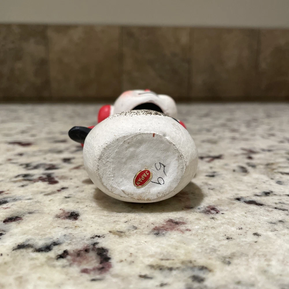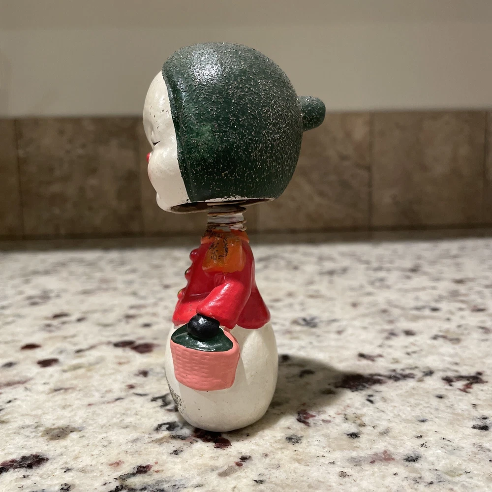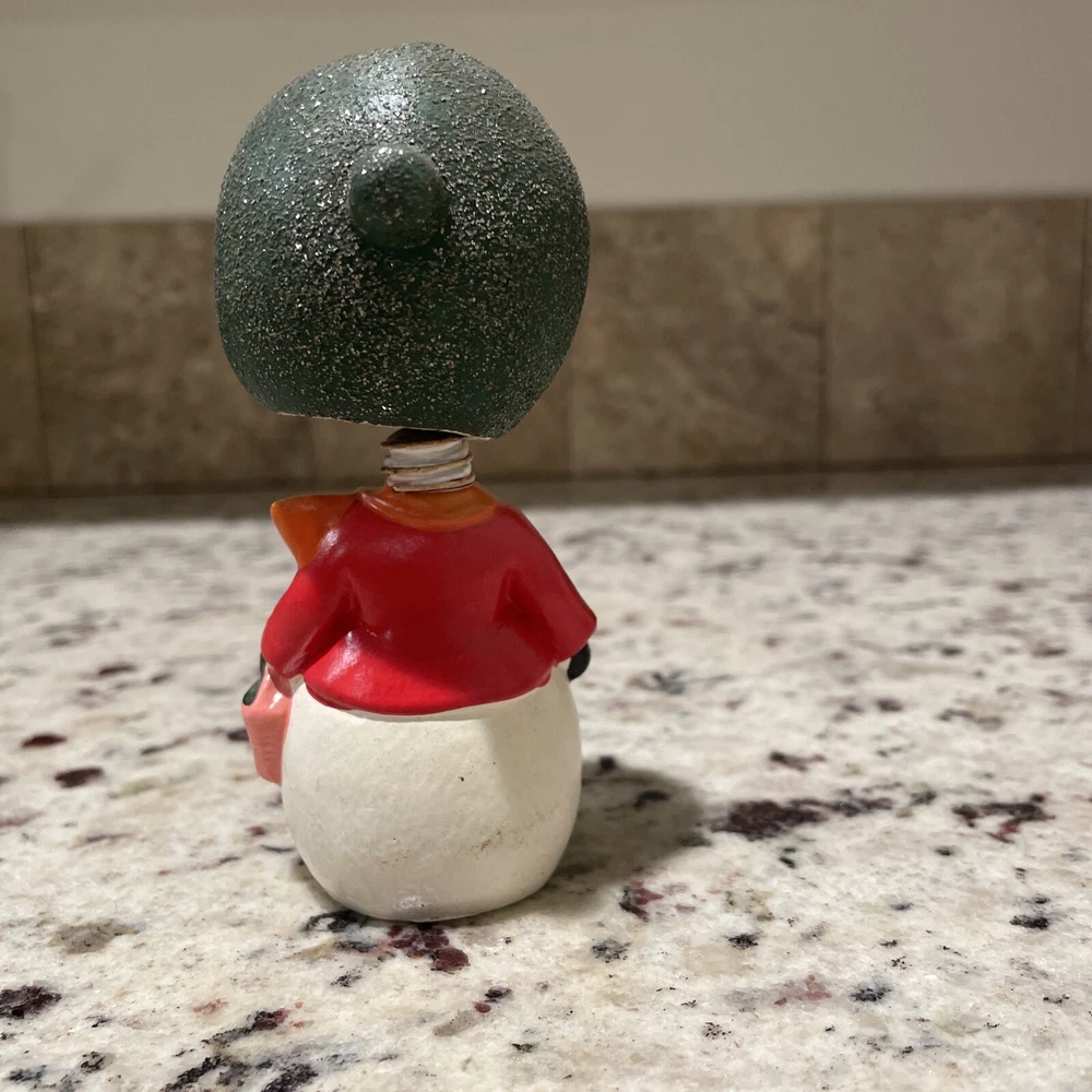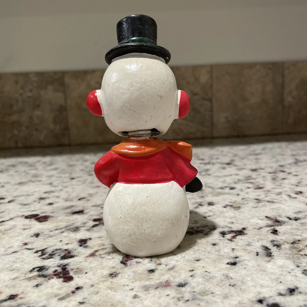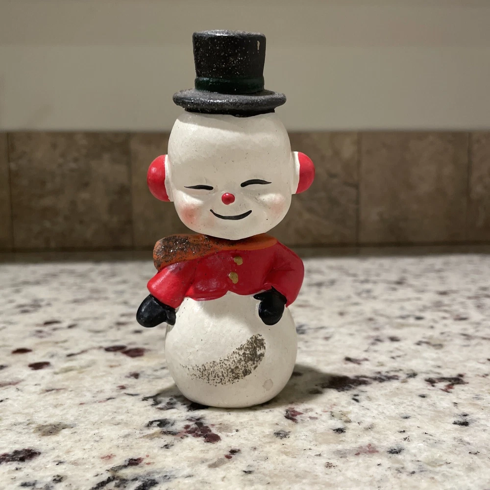 Vintage snowman and woman great condition bobbleheads nodders. Snowman has top hat with scarf gloves and coat. Snow woman has a head scarf, neck scarf, coat, gloves, and a basket. Small paint loss on snow woman’s scarf. See pics The snowman does have a slight lean to his head. Snowman is 5 inches tall and the snow woman is 4 3/4 inches tall . I am unsure of the material it is made from . Small manufacturers imperfections on swim woman’s face paint speckles and excess material on her lip. Snowman imperfections paint speckles and small pot on top hat where paint has come off. The year 1959 is written beside the Japan sticker.