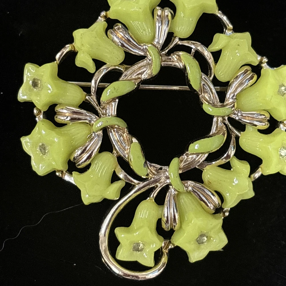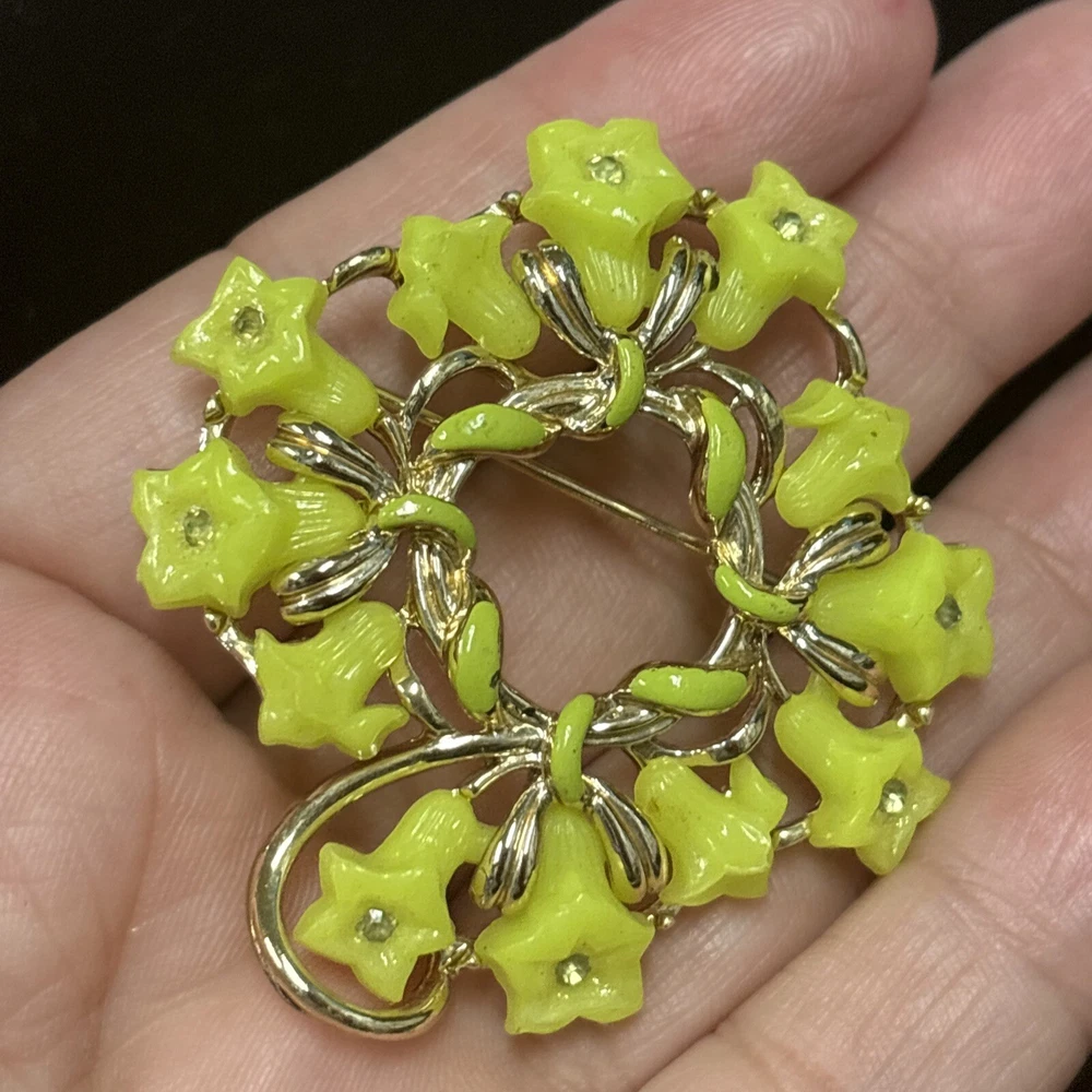 Add a touch of vintage charm to your outfit with this beautiful flower brooch. Crafted from gold-tone metal, this brooch features a lovely green color that will complement any outfit. Measuring at 2 inches in length, this brooch is perfect for any occasion, whether it be a birthday, anniversary, christening, or even Christmas. The brooch is designed in the shape of a flower and features a stunning green main stone color. The plastic material adds a unique touch to the brooch, making it a perfect addition to your vintage jewelry collection. This brooch is perfect for anyone who loves vintage jewelry and wants to add a touch of elegance to their outfit.