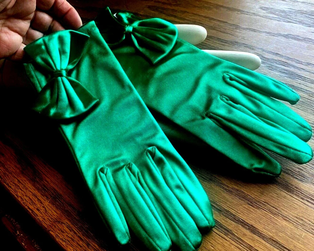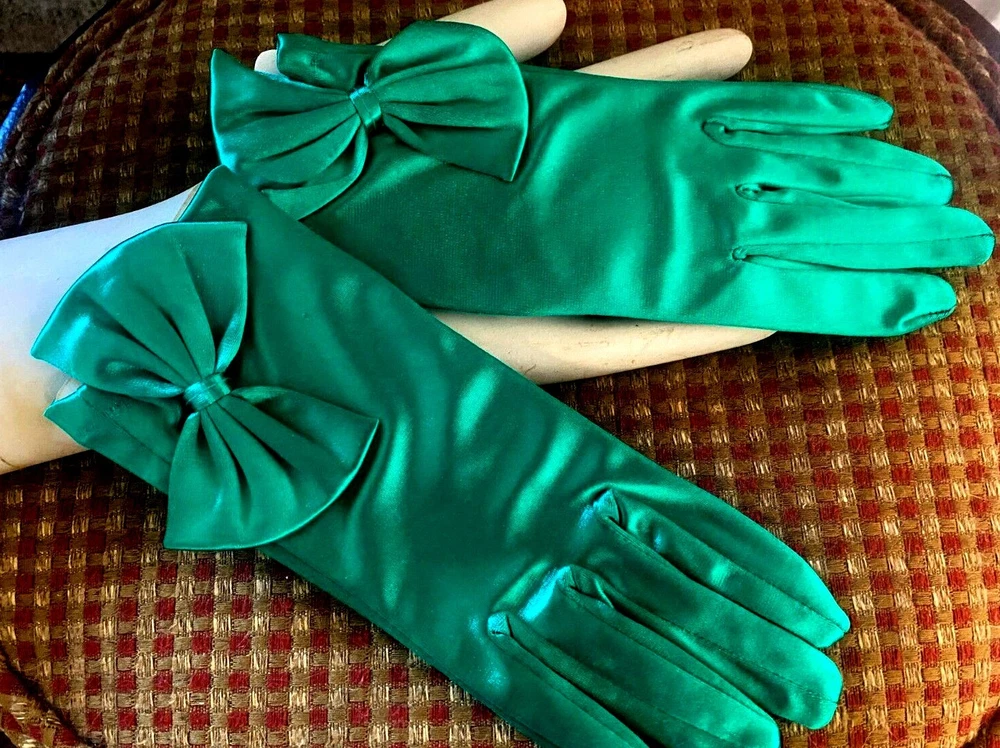 This listing is for one pair of Gloves Emerald One Size (they stretch) 1960's SATIN WRIST GLOVES Do visit my Ebay store for many more VINTAGE HATS/GLOVES Also Clearance Sale Overstock Ebay Store: trimsandribbons Ebay Seller: trims-n-treasures Instagram: linagallthetrimmings Shipped with USPS First Class/Advantage - Buy More from My Store to Save on Shipping. For combined shipping place items in your cart then request total from top right of cart using a computer. I will then send you an invoice to pay. Feature is not present on mobiles.