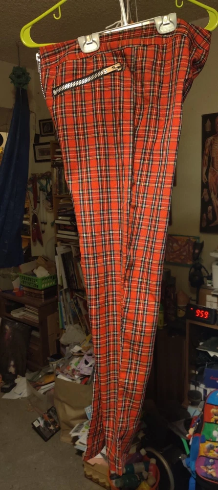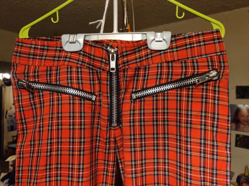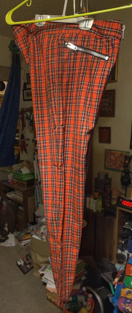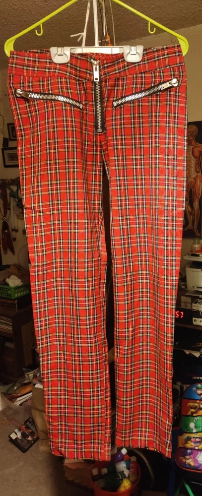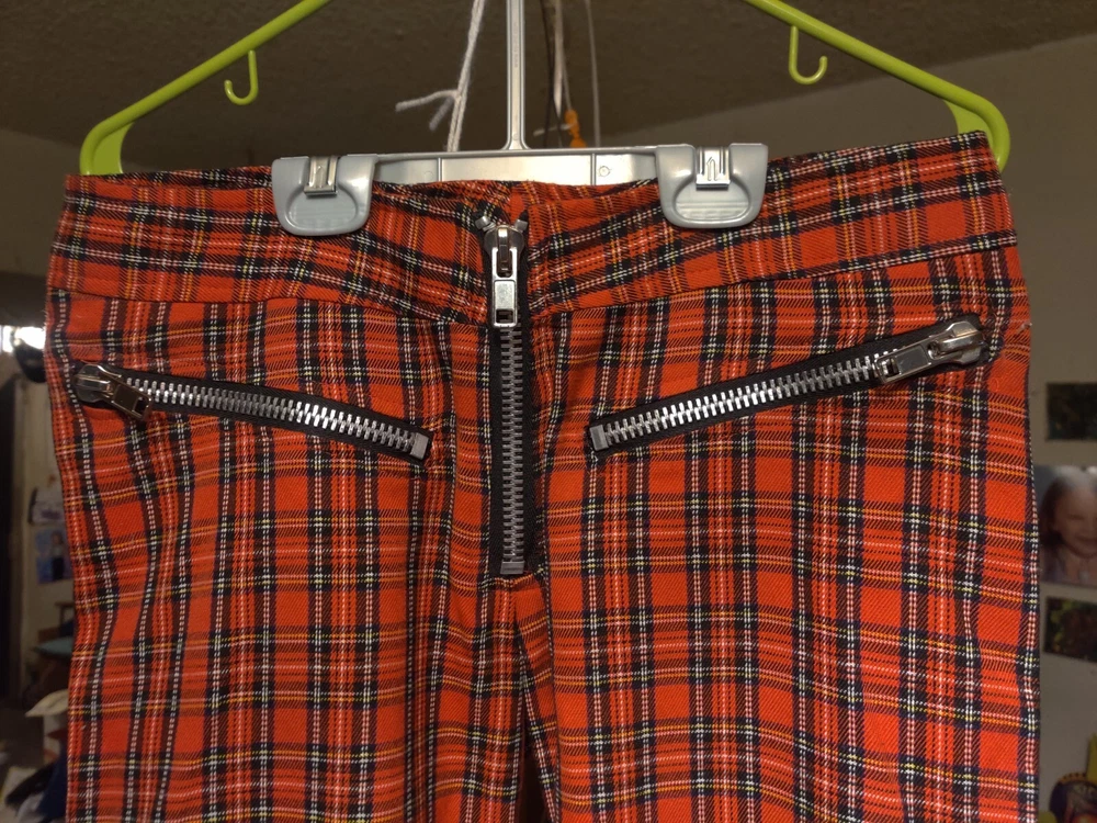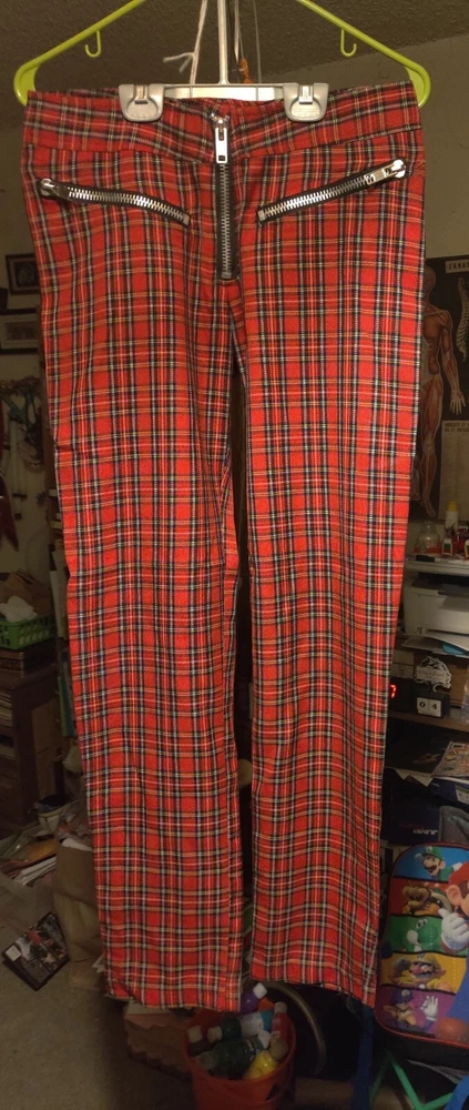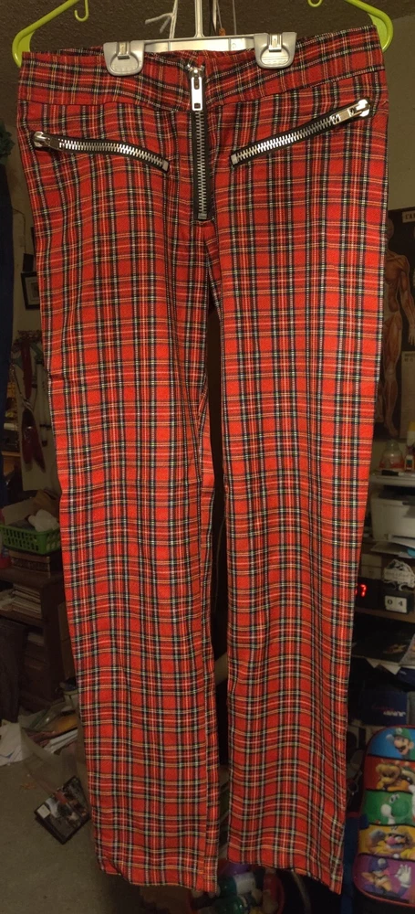 Material: Polyester, Rayon Fit: Slim Size Type: Regular Features: Zipper Size: M Vintage: Yes Color: Red Waist Size: 32 in Type: Pants Accents: Zipper Occasion: Casual Theme: Punk, 90s Inseam: 30 in Pattern: Plaid Style: Dress Pants Department: Women Brand: Lip Service Leg Style: Skinny