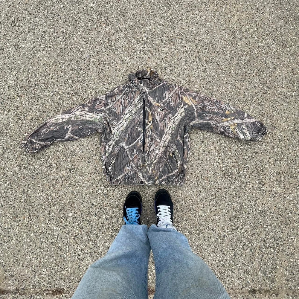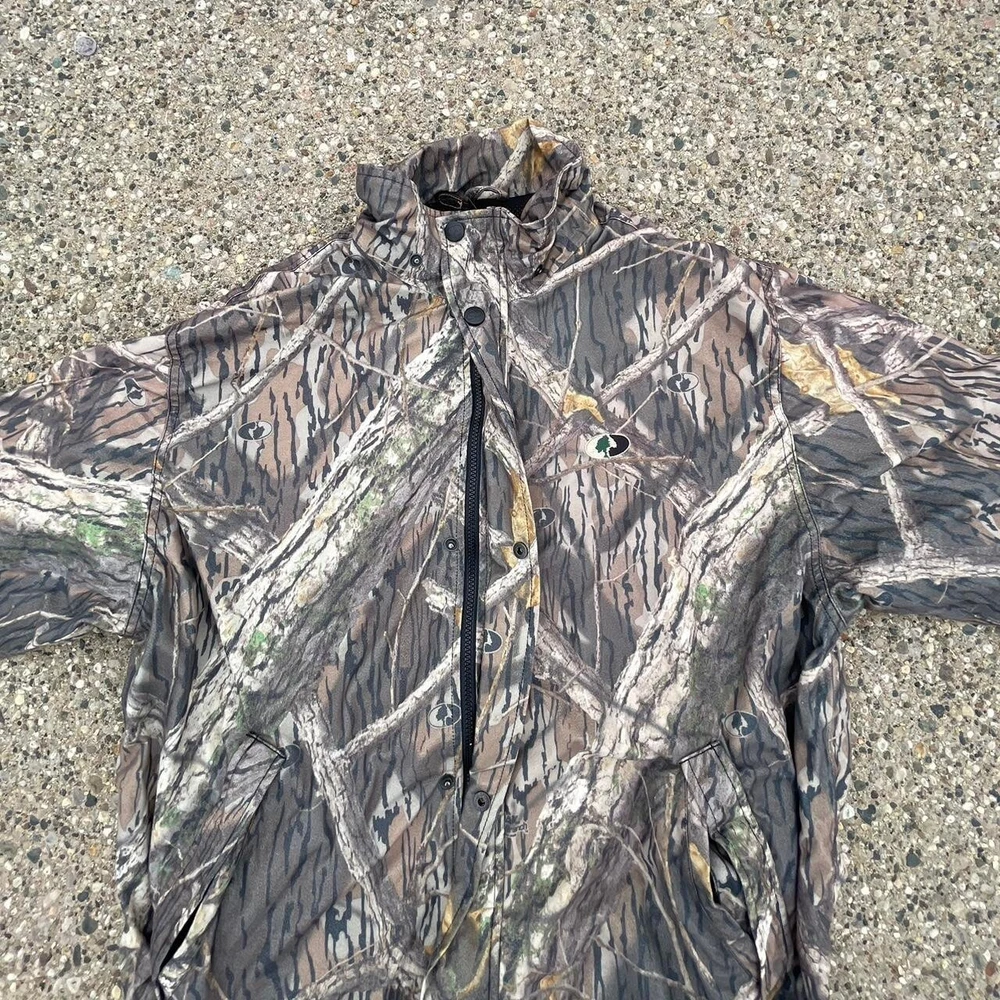 super cool vintage mossy oak zip up camo jacket with a great crop! with its zip-up design and button closure, it's perfect for layering over your favorite outfit. the jacket is sized XL and has a great crop, making it a comfortable and stylish choice for men, women, or anyone! the brown color adds a touch of sophistication, and the pattern is sure to turn heads. whether you're out in the field or running errands around town, this jacket is a versatile addition to your wardrobe.