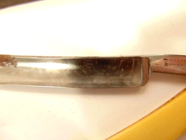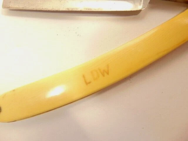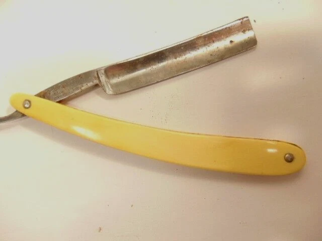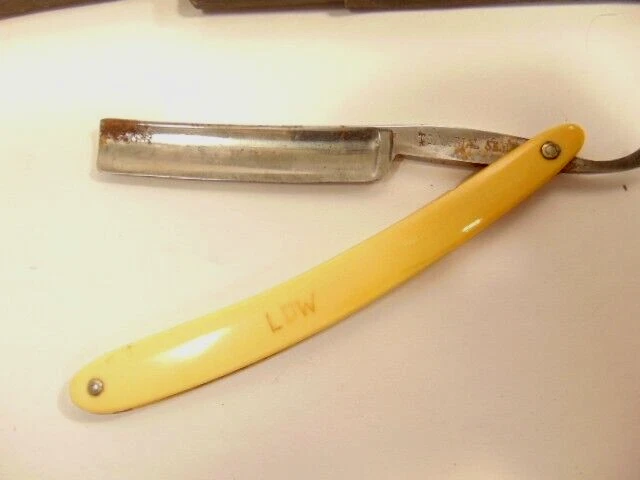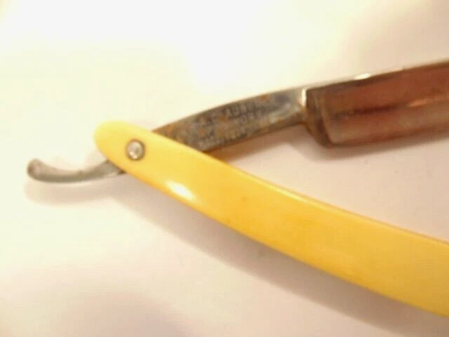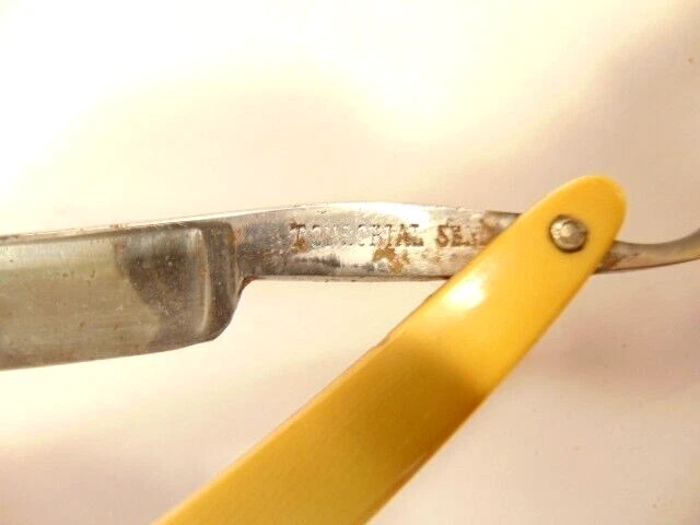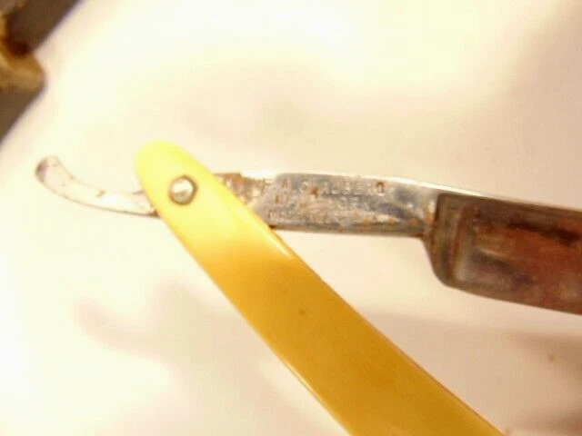 Here is a vintage straight razor marked A. Clauberg, New York, Made in Germany. On the opposite side it shows a brand name or type of razor but some lettering is obscured "Tonscrial Sen.." The razor measures about 6 1/8th inches long. The blade itself measures about 5 1/2 inches from end to end and is about 9/16th inches wide. The razor is in overall sound condition but has some dirt, spots of corrosion and initials on the handle, and other signs of wear and use. The box is not original with the razor. Please see the pictures and ask any questions. Thank you for looking. (Inv A24,453)