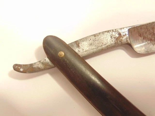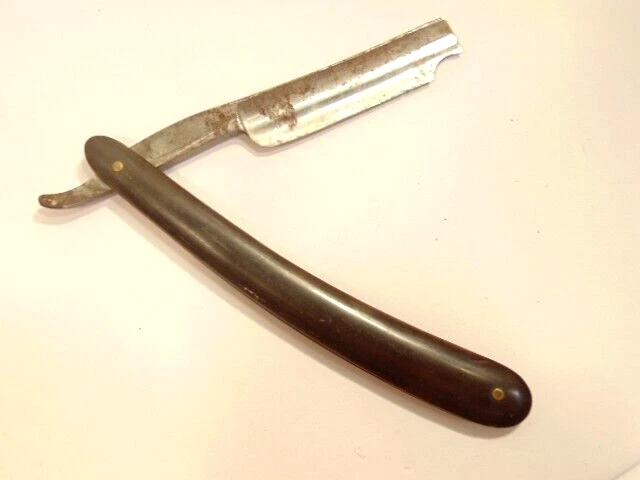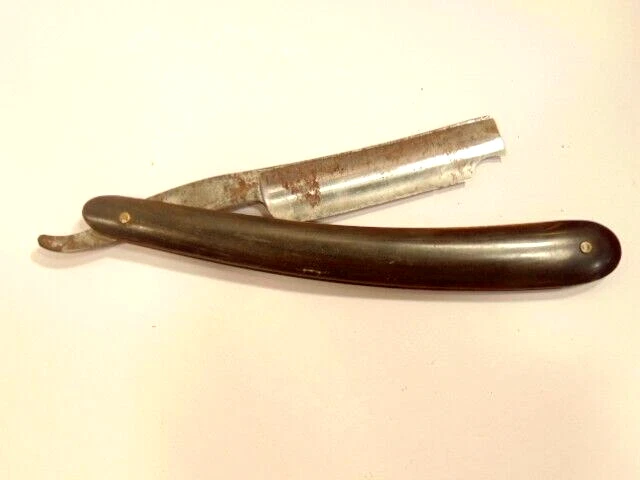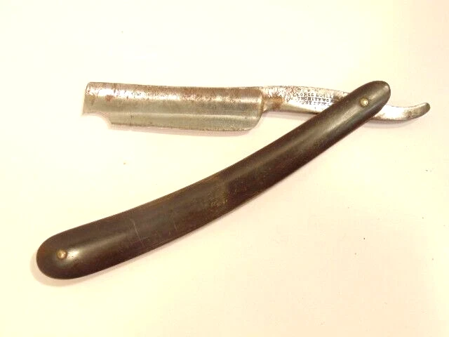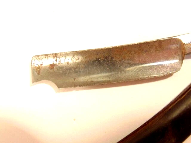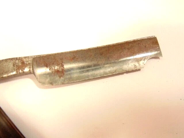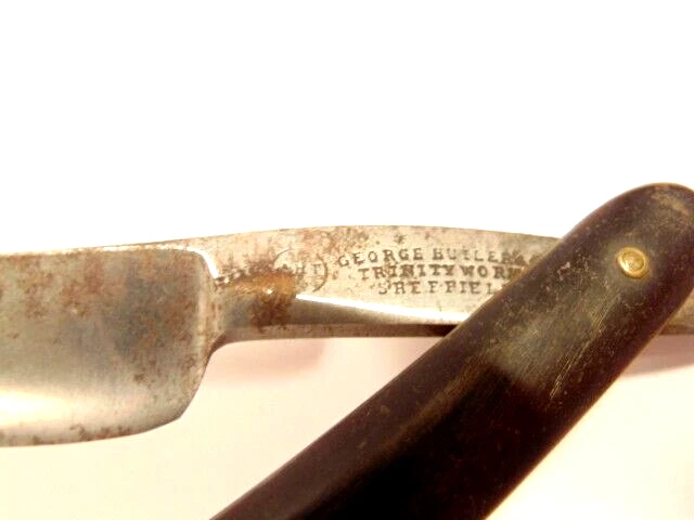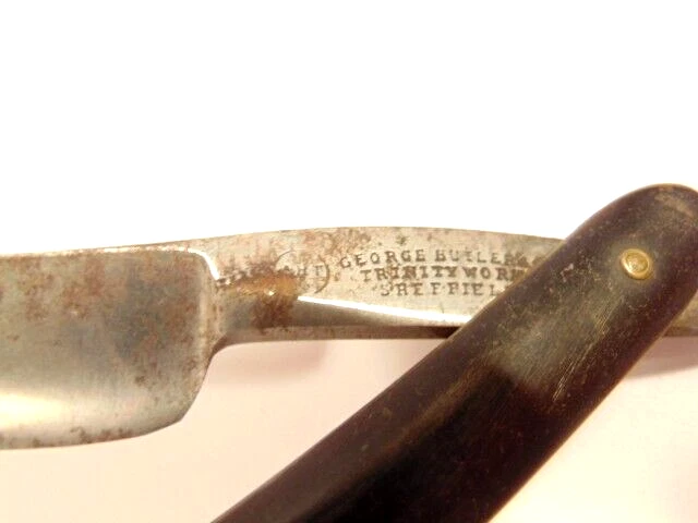 Here is a vintage straight razor marked "George Butler & Co Trinity Works, Sheffield". It is damaged with a chip at the tip of the blade. It measures about 6 1/2 inches from end to end when closed. The blade alone measures about 5 3//8th inches from tip to tip and is about 1/2 inches wide. The razor shows some dirt, staining, some corrosion and normal wear. The blade is chipped near the end. Please see the pictures and ask any questions. Thank you for looking. (Inv A27,831)