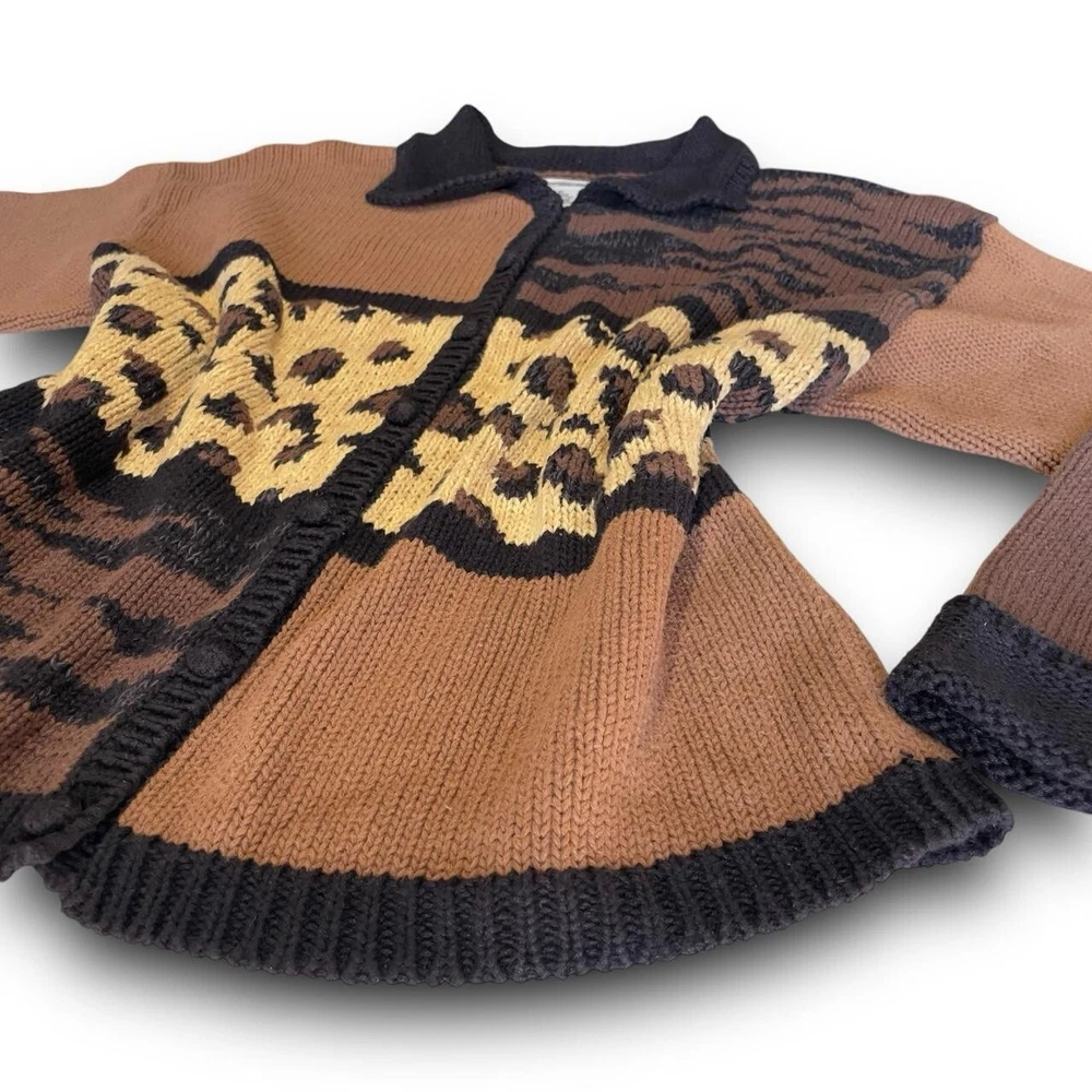 Neckline: Collared Character Family: Charmed Fabric Type: Knit Garment Care: Dry Clean Only Accents: Button, Crochet Size Type: Regular Season: Fall, Winter, Spring Fit: Relaxed Color: Multicolor Brand: Newport News Features: Graphic Print, Heavyweight, Oversized Theme: Animals, 80s, 90s, Art, Bohemian, City, Classic, Designer, Colorful, Geek, Holiday, Love, Preppy, Princess, Punk, Zebra, Leopard Sleeve Length: Long Sleeve Material: 55% Ramie 45% Cotton Vintage: Yes Pattern: Animal Print Character: Vintage, Fall, Angel Occasion: Casual, Travel, Party/Cocktail, Business, Workwear Country/Region of Manufacture: China Type: Sweater Style: Cardigan Size: XL Knit Style: Chunky-Knit Department: Women