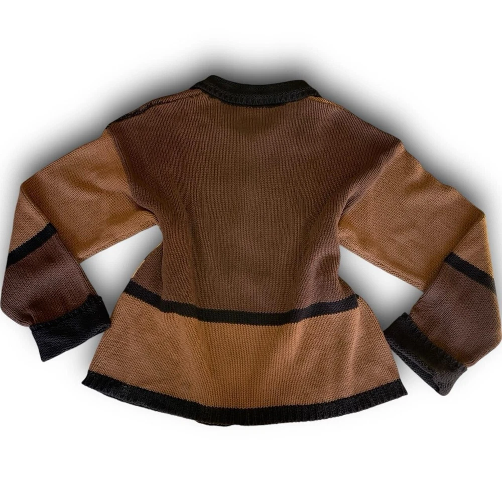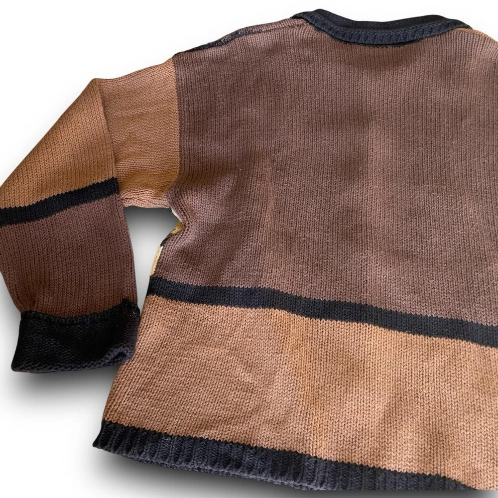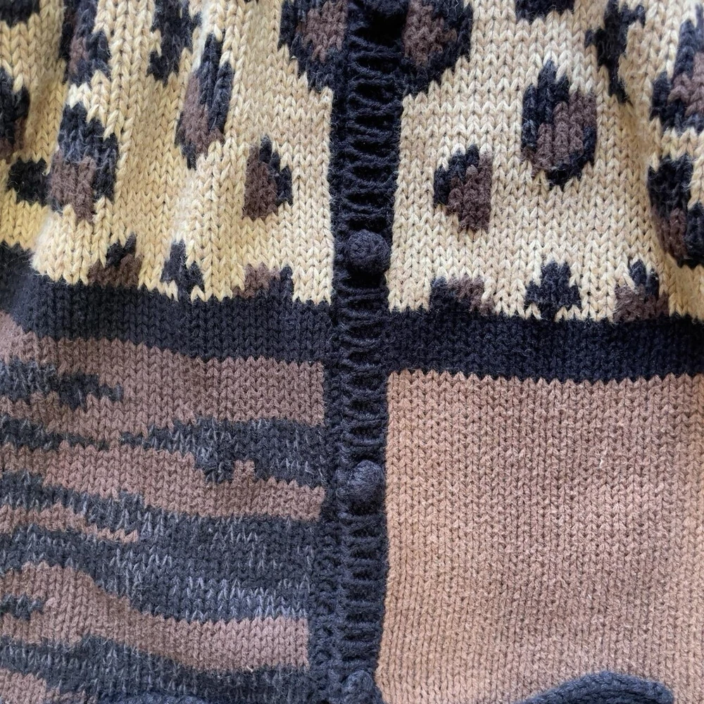 vtg animal print patchwork knit cardigan button up closure ~xl 🐆🦓 55% ramie 45% cotton vintage 80s 90s absolute precious oversized slouchy grannycore chunky knitted collared brown multicolor cardigan with long sleeves, folded cuffs & button up closure featuring crazy cool wacky leopard & zebra patchwork graphics along w/ retro stripe color block style allover in size xl. it’s giving jersey shore meets academia mob wife vibes✨ laid flat: chest 20” length 23” sleeves 20” vintage retro winter knits crochet animal print leopard zebra colorblock grannycore folklore muted cozy oversized multicolor chunky knit goblincore cottage farmhouse graphic bold fall urban grunge downtown pullover sweatshirt cardigan