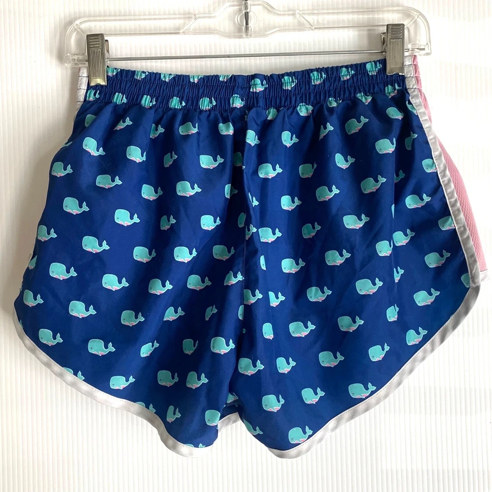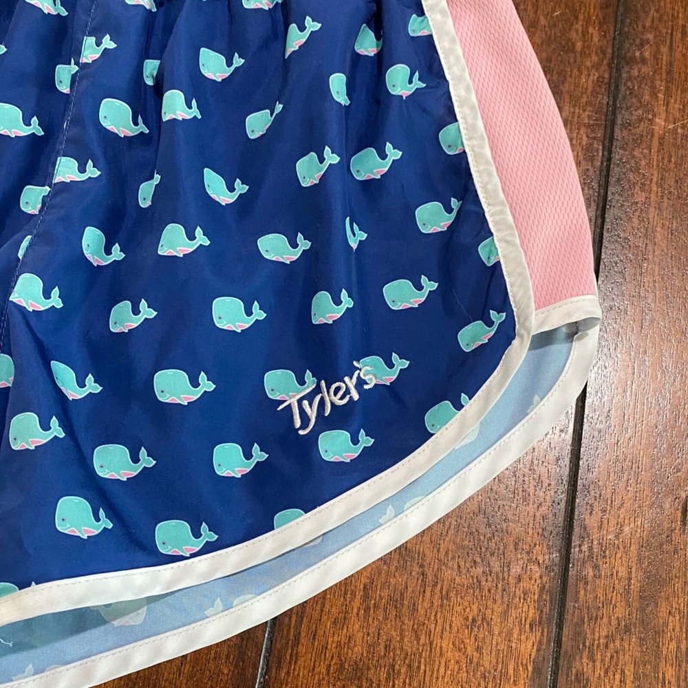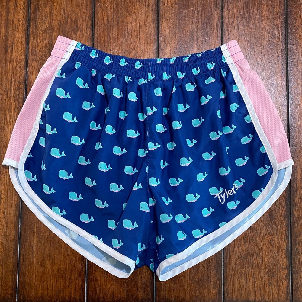 womens shorts size S small Tyler's store whale print running track athletic Pink shows slight fade. No stain or wash wear. Look very good overal. Tyler's is a popular shopping venue in Texas, and these were purchased on a visit to one of their locations. tyler's, tyler's store, Tyler's texas, running shorts, athletic shorts, size s, size small