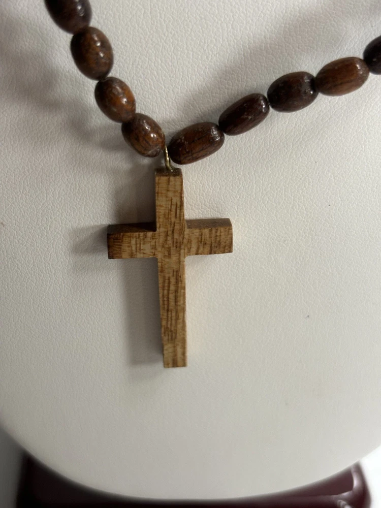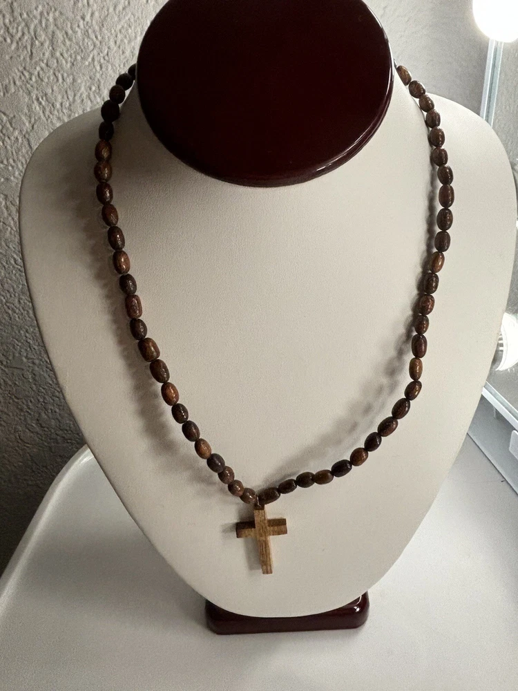 This unique necklace features a wooden cross pendant, perfect for those who appreciate a touch of religious symbolism in their jewelry. The necklace is crafted from high-quality wood and features a beaded design that adds a rustic touch to any outfit. Ideal for those who enjoy handmade jewelry, this necklace is perfect for any occasion. The cross pendant is unbranded, adding to the unique and authentic feel of this piece.
