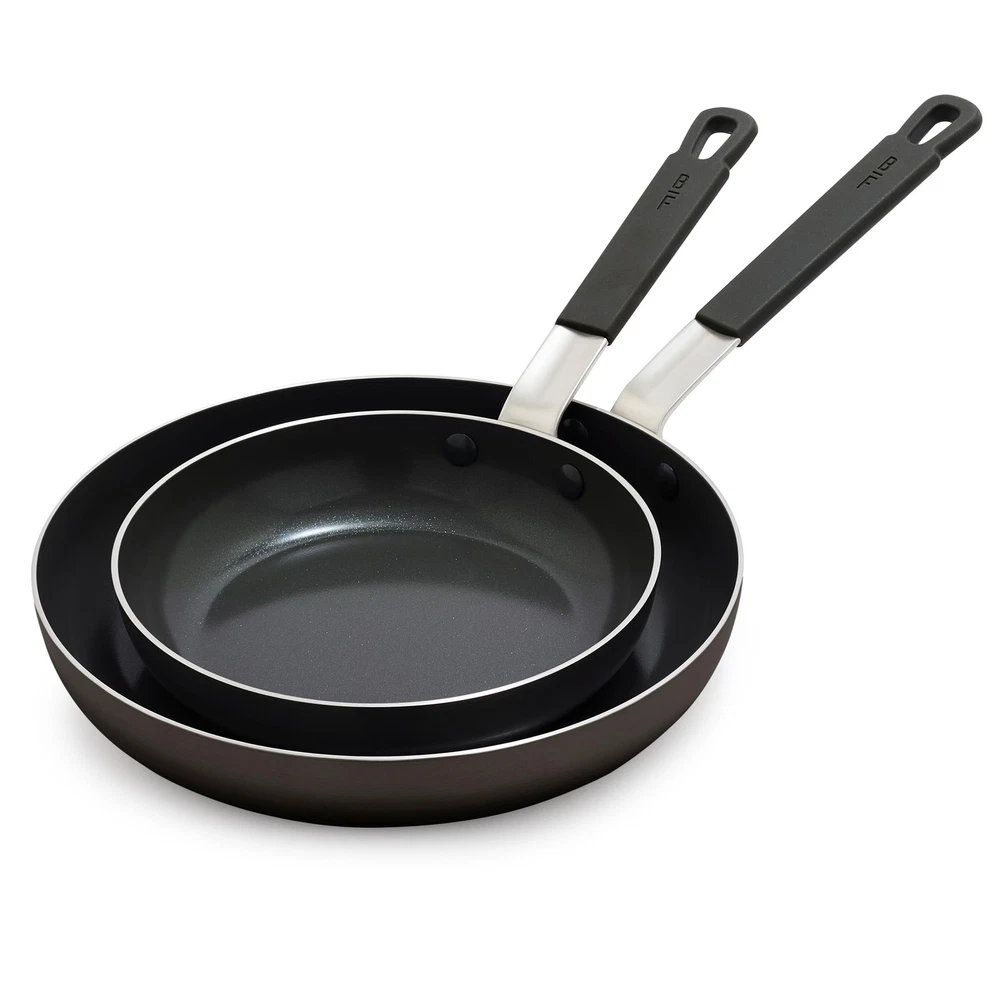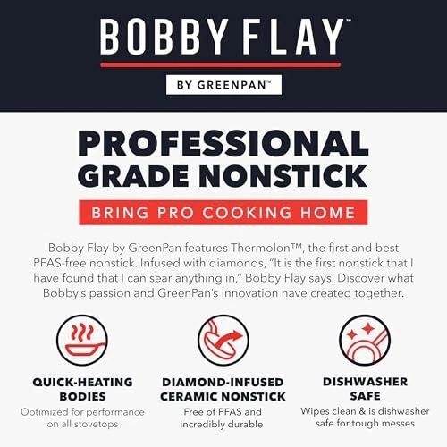 "World-renowned chef, TV host, restaurateur, and author Bobby Flay partnered with to bring years of expertise and cooking innovation to this cutting-edge collection. Crafted from quick-heating aluminum, these pans let you dial in the right temp so you can master your meals. This frying pan set features ’s signature diamond-infused ceramic nonstick coating to deliver years of powerful PFAS-free performance. The toxin-free coating is free of PFAS, PFOA, lead, and cadmium for remarkable worry-free performance. Each pan is packed with helpful details and ’s groundbreaking cooking technology. The generous chef handles stay cool to keep cooking comfortable so you can focus on flavor. Plus, the chip-free edges help prevent chips and dings to the coating for long-lasting performance and added durability. The tempered glass lids let you keep an eye on your meal as you cook while the wide handles make each safe and easy to remove. Designed to deliver in any kitchen, this frypan set is optimized for performance on all stovetops, including induction. The pans are oven safe up to 392˚F and dishwasher safe for effortless cleanup. " BOBBY FLAY x : Legendary chef Bobby Flay partnered with to create innovative cookware that brings pro cooking to any home SET INCLUDES: 8” frying pan and 10” frying pan REINFORCED WITH DIAMONDS: This collection features ’s diamond-infused ceramic nonstick for incredible release, remarkable durability, and professional performance TOXIN-FREE: 's signature healthy ceramic nonstick coating is free of PFAS, PFOA, lead, and cadmium STAY-COOL CHEF HANDLES: Inspired by restaurant kitchens, these pans have long chef handles with stay-cool silicone grips that give you total control and amazing comfort QUICK-HEATING BODIES: Quick-heating bodies let you better control your heat so you can dial in the right temp for your meal CHIP-FREE RIMS: Ingenious, thoughtfully designed chip-free rims add extra strength and durability INDUCTION READY: Bring pro cooking where you need it: suitable for all stovetops including gas, electric, even induction, and oven safe up to 392˚F EASY TO CLEAN: Dishwasher safe and easy to clean for simple cleanup