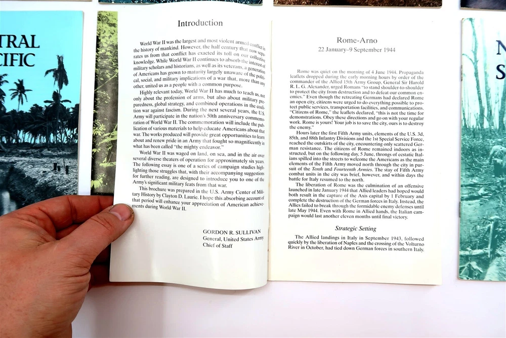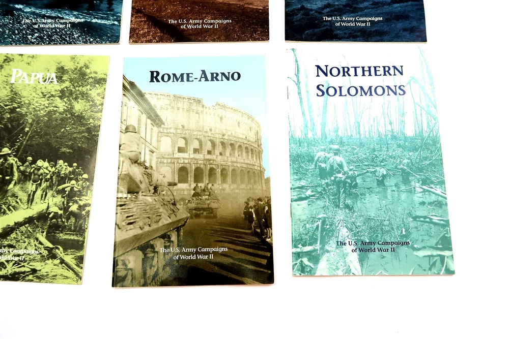 x8 US ARMY CAMPAIGNS OF WORLD WAR II Booklets Egypt, Italy, Papua, Algeria, etc. This eBay listing is for a set of 8 different softback books that are part of the US ARMY CAMPAIGNS OF WORLD WAR II series. Each book measures 8.5" tall and shows to be in very good condition. Age is unknown but I think these are from the 1980's era. Please refer to all the pictures to see what all books are included in this lot. Seller Location Reference - Comics Box 22 BID IN CONFIDENCE – CHECK MY FEEDBACK! My goal is your satisfaction. I leave positive feedback right after the payment is received for all orders!! If you plan to leave anything less than positive feedback and 5 stars - please let me know so that I can work out any problems that you may have. I aim to please!! SHIPPING & HANDLING FOR US BIDDERS We ship ASAP upon payment as noted above within 1 business day 99% of the time!! We normally pack up your new treasures 2 - 3 times a day and ship using USPS and Fedex Ground so that you get your items in a timely fashion. As always - there is no charge for local pickup on any of my items!! SHIPPING AND HANDLING FOR INTERNATIONAL BIDDERS Import duties, taxes and charges are not included in the item price or shipping charges. These charges are the buyer’s responsibility. Please check with your country’s customs office to determine what these additional costs will be prior to bidding/buying.” THANK YOU AND HAVE A WONDERFUL DAY!! Powered by SixBit's eCommerce Solution