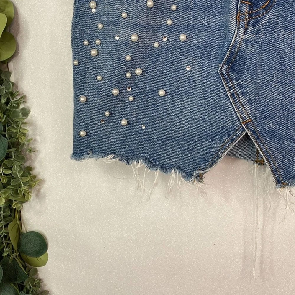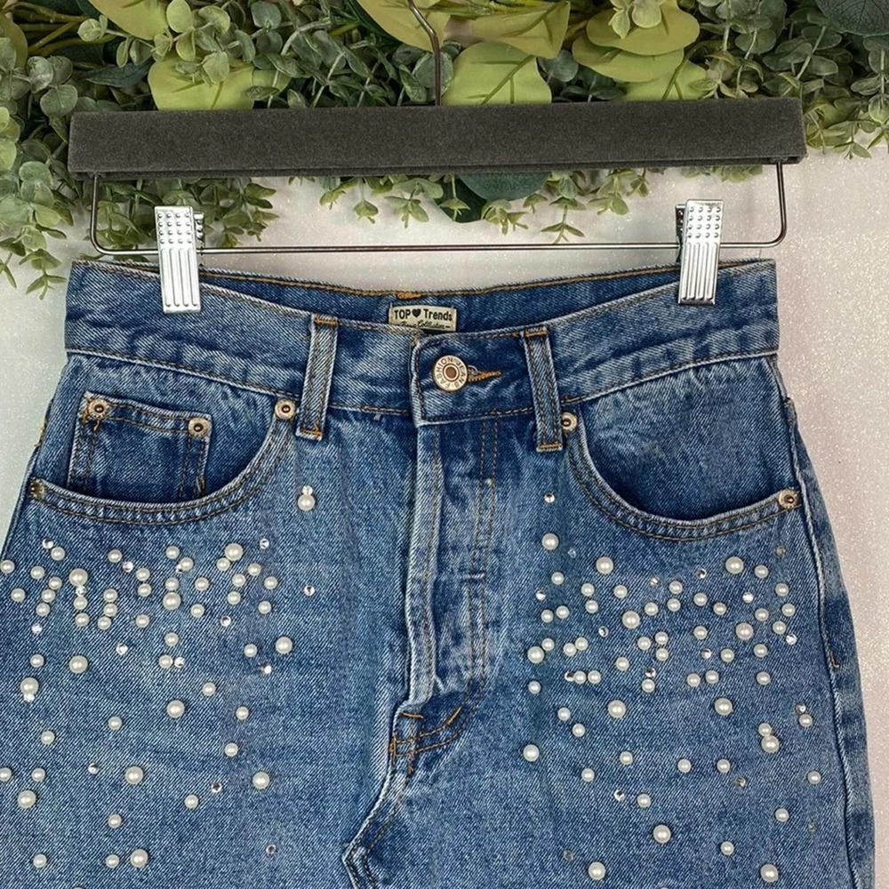 Condition: pre-loved, no visible flaws “Top Trends” Distressed Denim Pearl Mini Skirt Pearl details Zipper & Button closure 5 pockets 98% Cotton , 2% Spandex Size 36 (see measurements) #denim #distressed #mini #pearls #y2k Measurements are approx Waist: 26 inches Length: 15 inches SK35