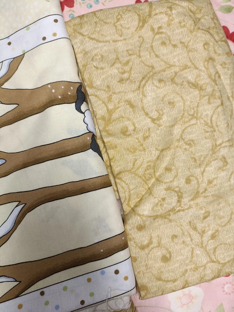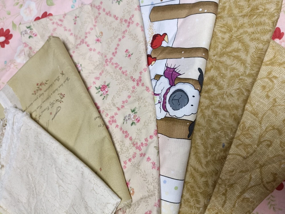 Lovely yellow/beige cotton quilting scrap fabric lot. Fabric is cut in different sizes. Includes florals, vintage motifs, picturesque cartoons, etc. high quality cotton.