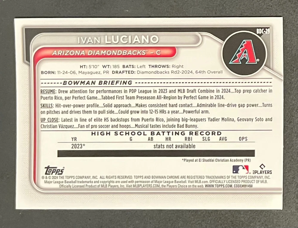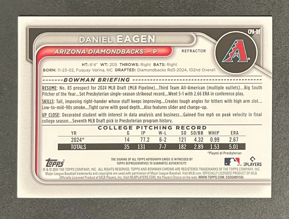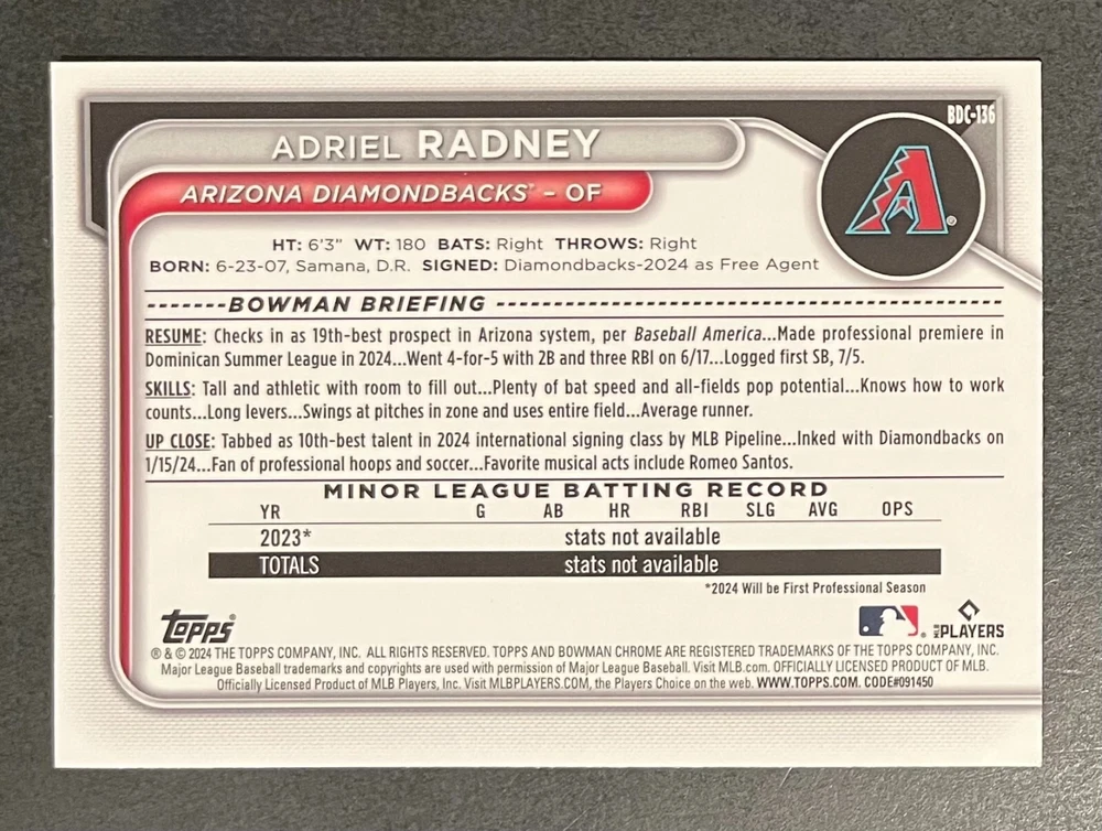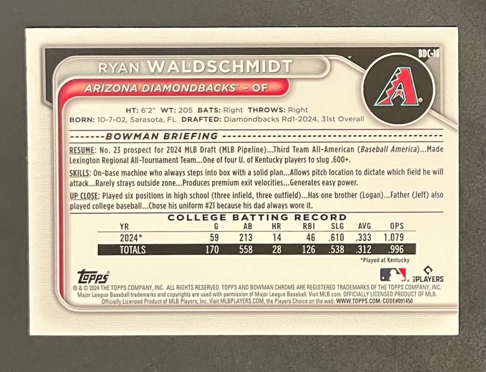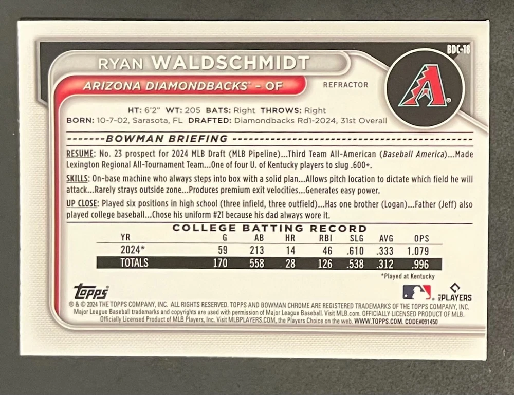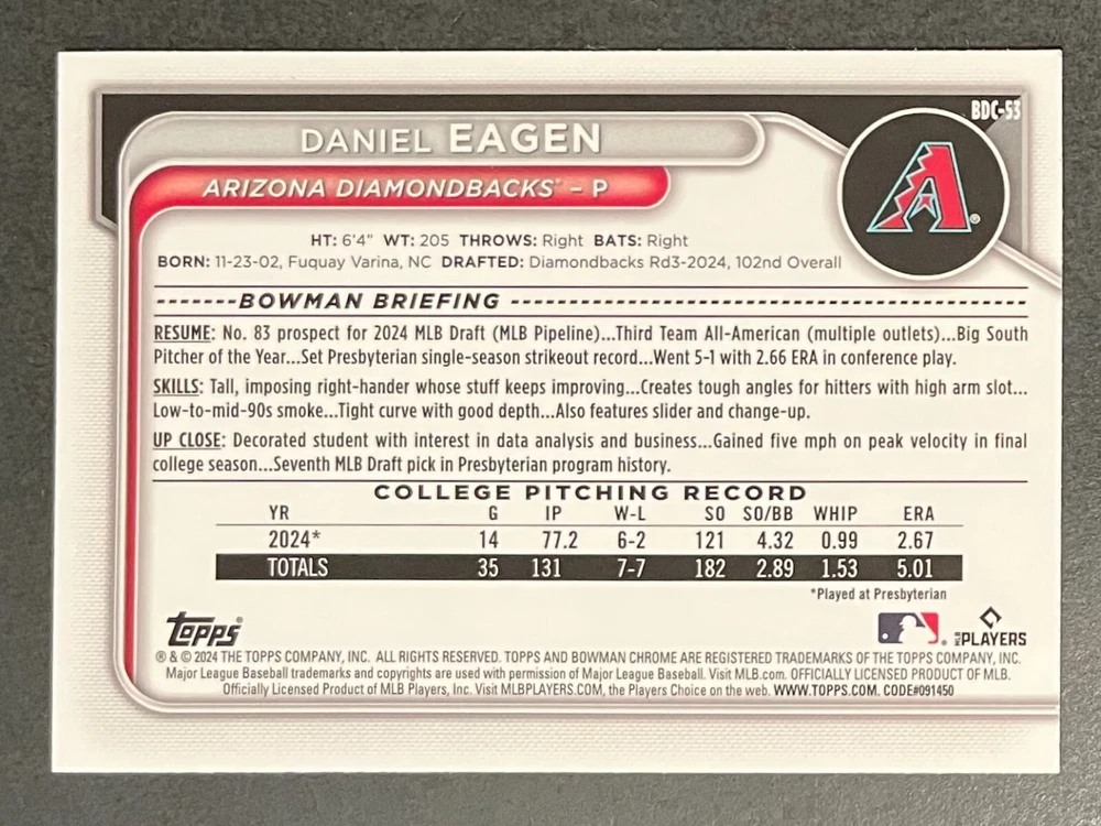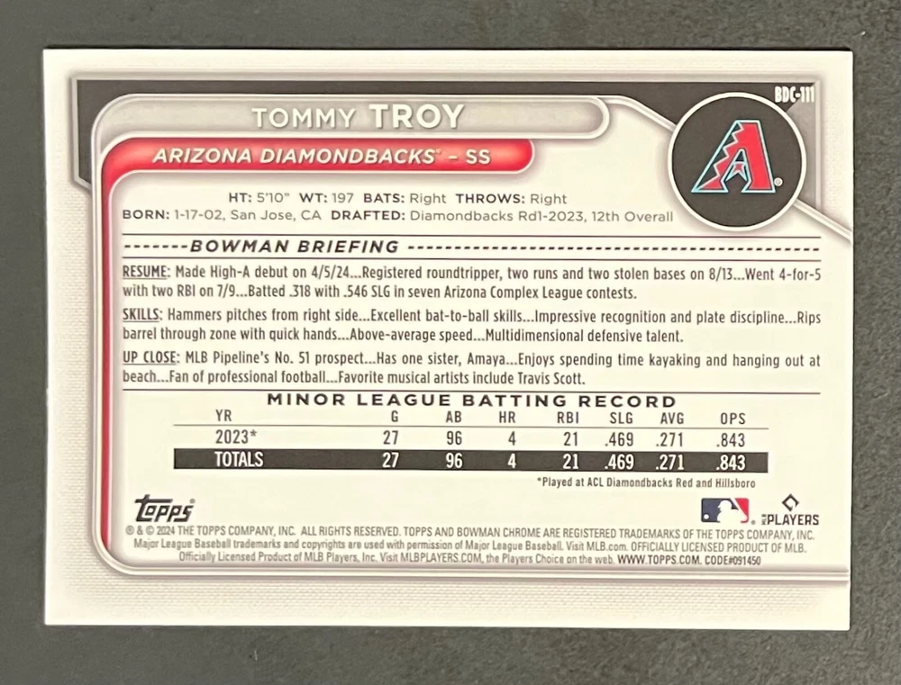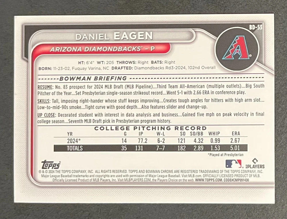 Low-cost shipping. Discounts if you buy more. I also have other listings from 2021-2024 2024 Bowman Draft Pick your own favorite Arizona Diamondbacks draft picks and prospects (see https://www.mlb.com/prospects/reds for more on each player)