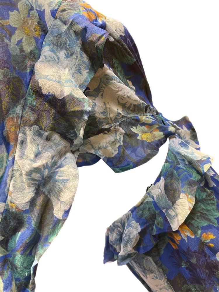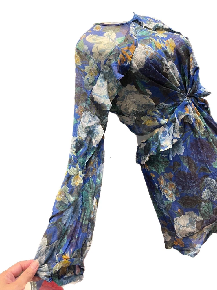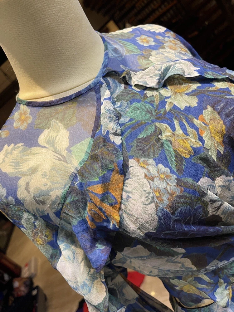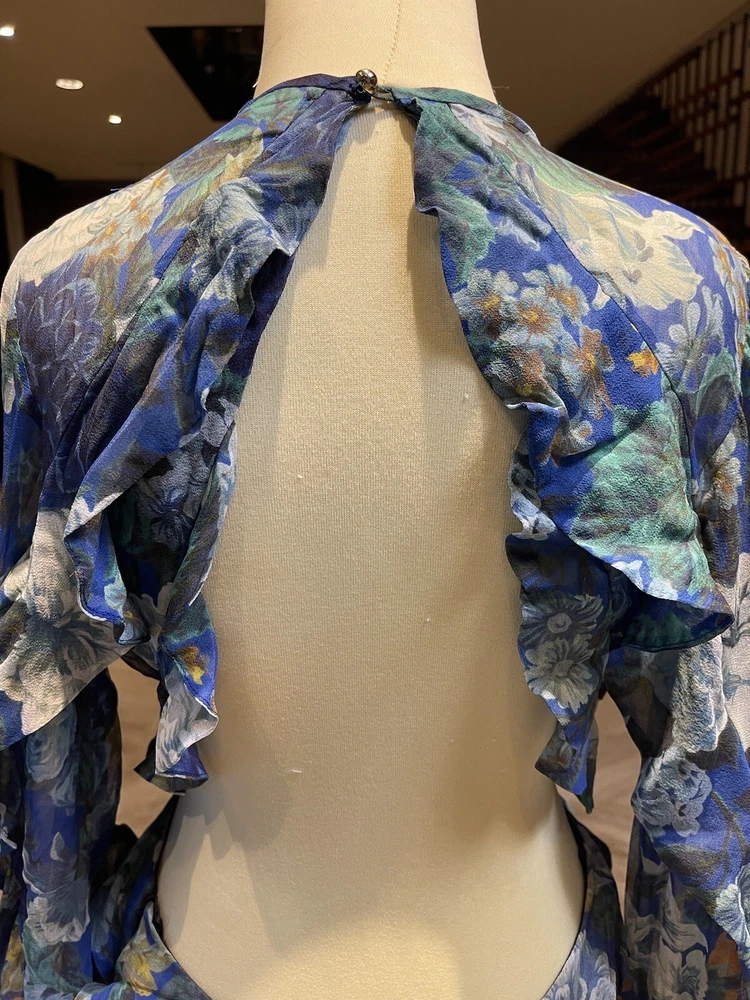 This Zimmermann dress is a pre-owned size 2 made from 100% silk with a blue colour. The dress features a long balloon sleeve, round neck, button closure, and ruffle accents. It has a fit and flare style with a drop waist and is perfect for various occasions such as travel, weddings, holy communion, parties, and more. Additional features include a backless design, side zipper, and lightweight feel. The dress is lined and has a fabric type of rayon. It's a great addition to any wardrobe with its designer, beach, classic, and fun themes. Made in Australia, it's suitable for all seasons and can be dressed up or down for casual or formal events.